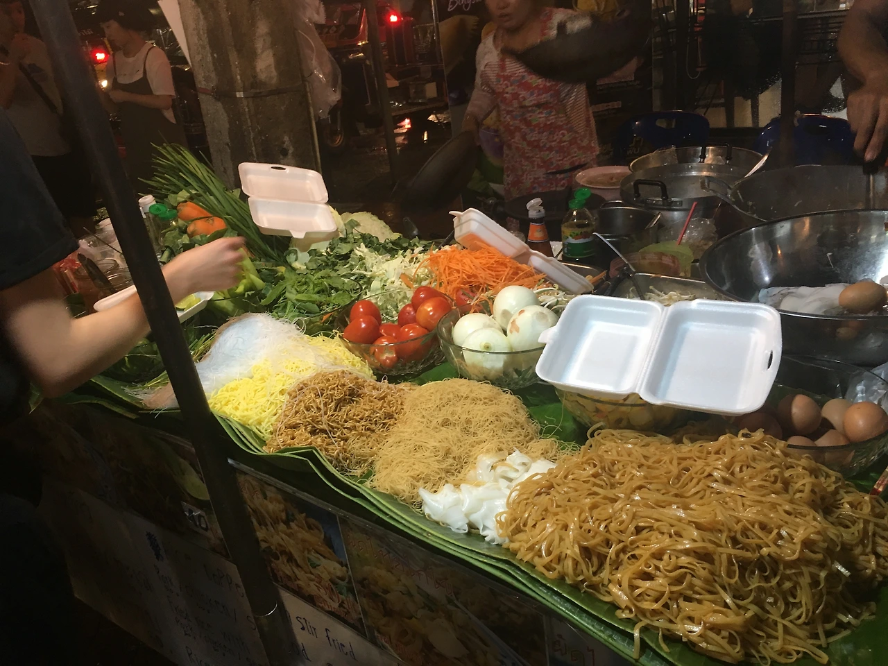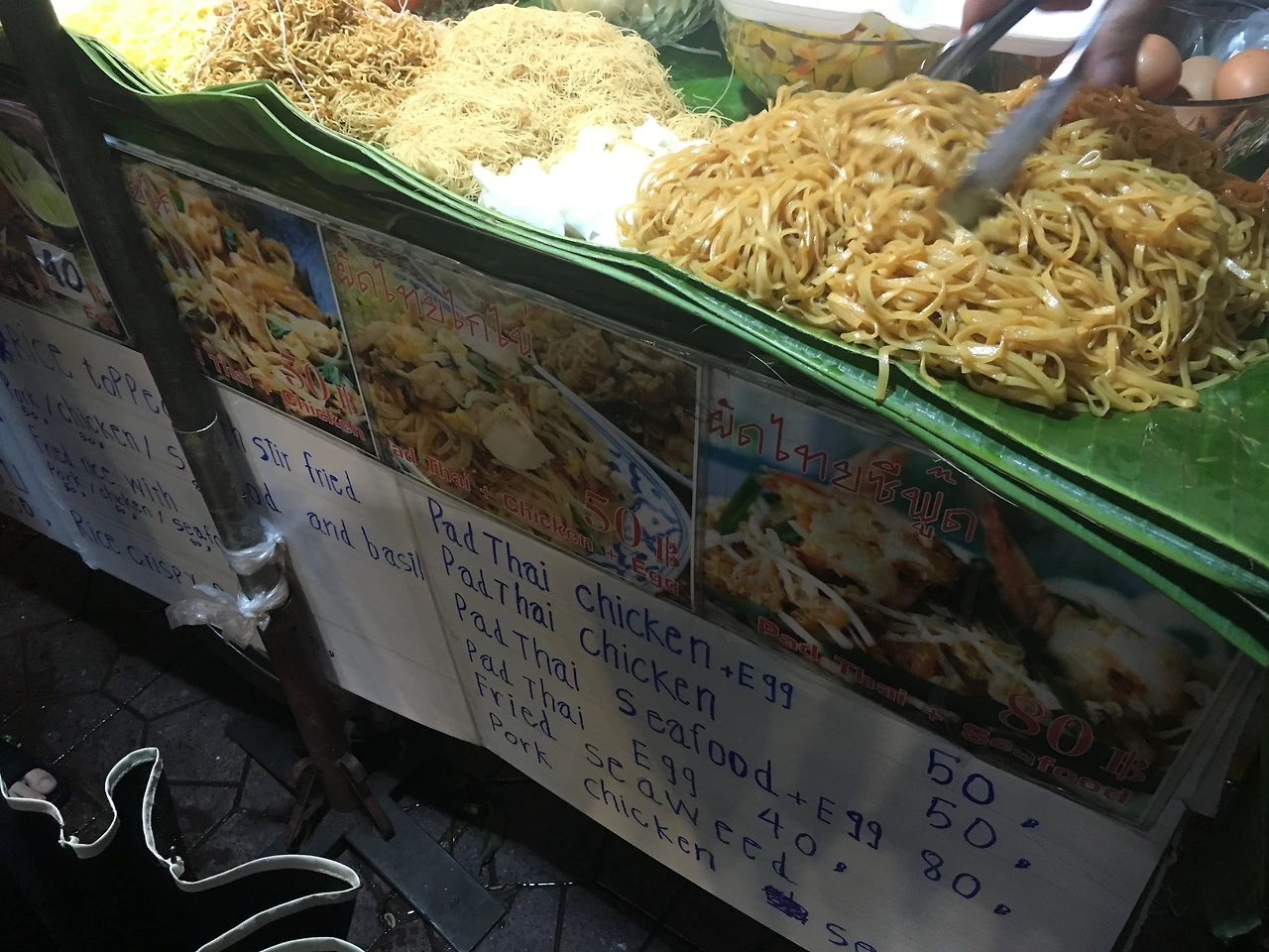 그래서 노점에서 뚝딱 먹는 팟타이가 오히려 더 맛있는 느낌이다. 우리는 카오산로드에서 가장 사람들이 줄을 많이 선 곳에 가서 팟타이를 먹었다. 이곳에서는 면, 안에 들어가는 재료 등을 모두 고를 수 있었는데 우리는 중간 크기의 면에 '해산물+계란(PadThail seafood+egg)'을 넣고 볶아 달라고 요청했다.