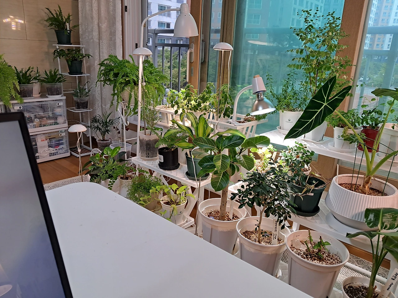 실내가드닝을 한 지 10개월에 접어들고 있다. 꽃에 눈이 멀어 시작했던 가드닝은 점점 확장돼 내가 좋아하는 꽃에서 '우리 집에 맞는 식물들이기'로 바뀌었다. 처음엔 호기롭게 내 의지로 식물등만 있으면 충분할 거라 여겼지만 화초들은 햇빛의 광량이 약하니 저절로 떠나갔다. 계절에 맞춰 사면 괜찮을 거라며 또 스스로를 설득하고 데리고 왔던 화초들이 연이어 죽어나가자 더 이상 봄이 되지 않는 한 꽃이 피는 건 어렵다는 걸 깨닫게 됐다. 우리 집의 햇빛 환경, 온습도, 병충해의 습격 등등에 의해 일부 식물들이 남겨졌다. 우리 집 화초들은 내가 정한 게 아니라 저절로 살아있는 식물끼리의 조합이 생겼다. 지난 시절에 스쳐간 화초 사진을 보면 정말 너무 아름답다. 지금 봐도 혹할 만큼 너무 아름다워서 함께했던 시간들이나 그 노력과 열정이 아깝거나 시간을 허비했다고는 하지 못한다. 충분히 기쁨을 느꼈기 때문이다. 또 식물 자체가 아니라 꽃만 보려 했던 나를 볼 수 있게 해 줬기 때문이다. 이제 겨우 1년을 채워가는 초보 식집사는 집에 생물을 들이는 게 아니라 꽃만을 들이고 싶었던 거였다. 그게 허황되거나 나쁜 마음은 아니지만 내 상황에서 고집 있게 밀어붙여서 될 일이 있고 내려놓고 받아들여야 하는 일이 있다는 걸 깨달은 것이다. 식물을 오랫동안 키우려면 과정을 오랫동안 지켜볼 줄 아는 사람이 되어야 한다는 걸 깨달았고 집에 맞는 식물을 고르는 것이 서로 상생하는 관계가 된다는 것도 알게 됐다. 우리집엔 대체로 튼튼하기로 유명한 야자 나무류, 여인초나 극락조같은 관엽수, 고무나무류는 아주 무탈하게 잘 크고있다. 광량이 너무 많으면 잎이 탄다는 고사리류는 동향의 우리집엔 너무 잘 맞아 잘 자라고있다.