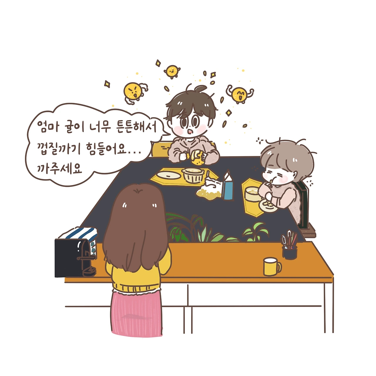 작둥이가 귤 까기 힘들었는지 귤껍질을 까달라고 하는데