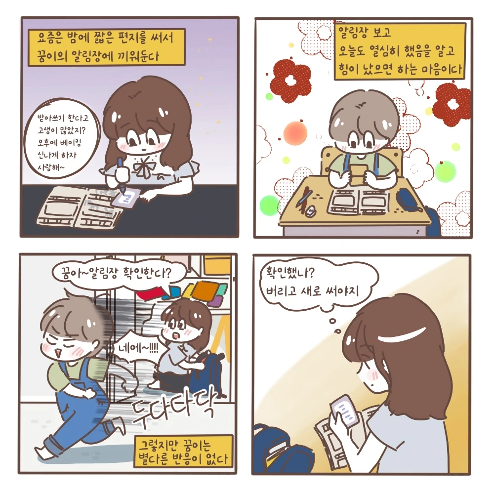 요즘은 밤에 짧은 편지를 써서 꿈이의 알림장에 꽂아두는데