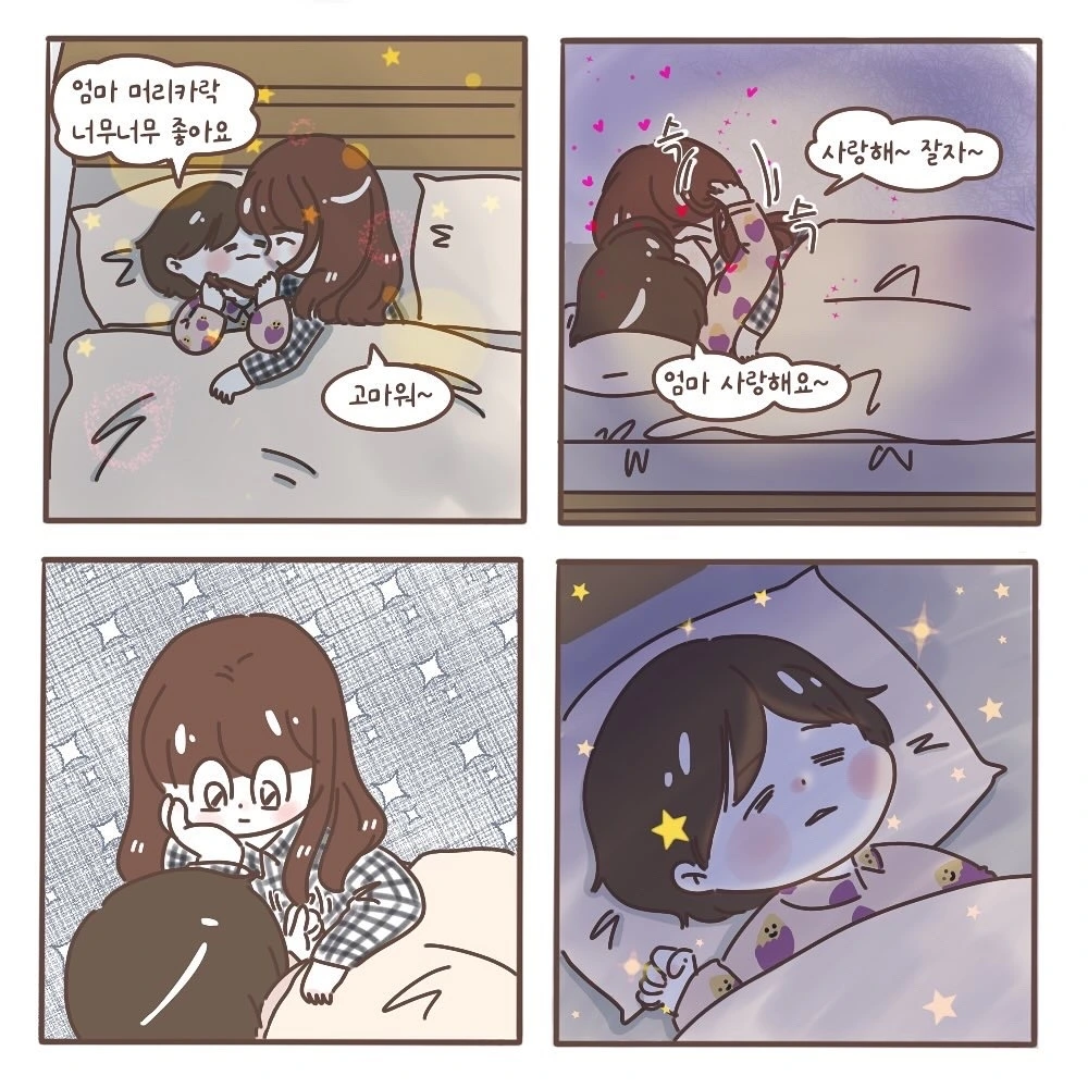 잠들 때 엄마 머리카락 만지면서 향기 맡는 걸 좋아하는데
