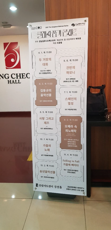 강남심포니는 자체 낮콘서트를 진행한다는 게 특이 포인트다. 옛날 옛적에는 강남구민회관에서 전석 무료로 운영했지만 협연자가 관객석 계단으로 올라와야 할 정도의 무대 크기와 클덕들 고혈압 유발 음향 때문에 광림아트홀로 이사 왔다. 전석 무료 선착순 자리배정은 남산 넘고 한강 건너오는 원정러에겐 구석자리만 나오니 탁월한 선택이다.