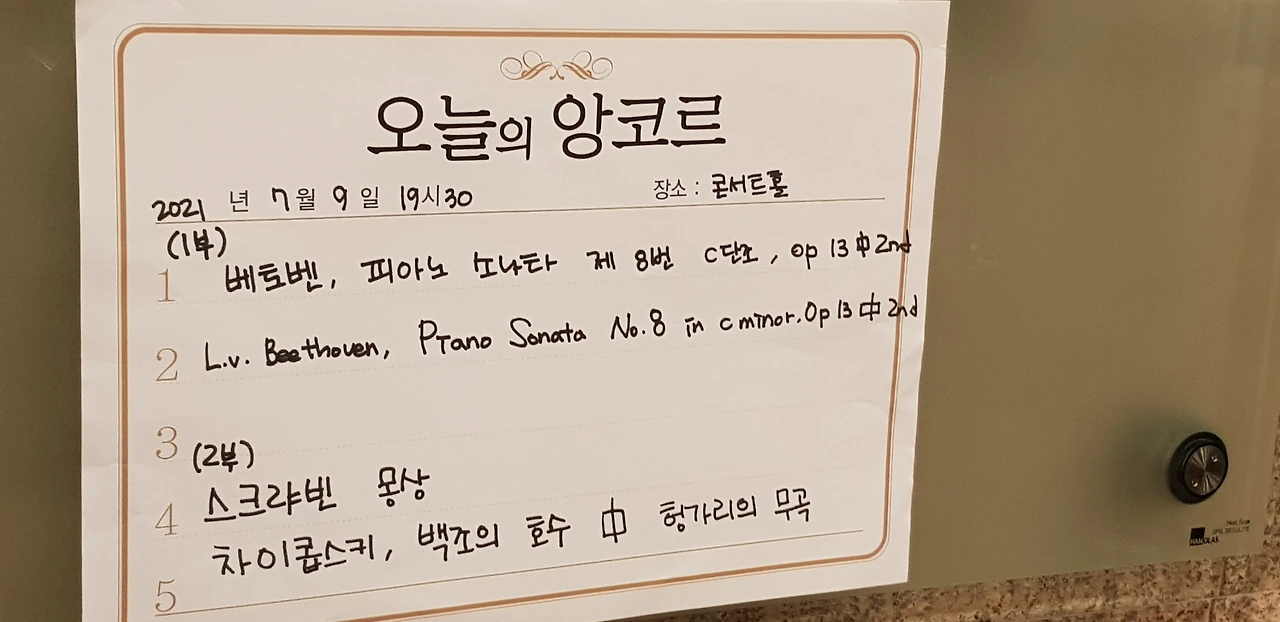 공연 역사상 최초로 중블 1열에 앉은 역사적인 날이기도 하다. 하지만 피아노 협연이라 미하일 님은 다리만 보이고 손민수 님은 발과 오묘한 표정만 보이는 시야였다. 그래도 관크 청정구역이라는 특급 장점이 있으니 다 필요 없고 관크만 피하고 싶다면 강추다.(벨소리 관크도 자잘한 수준이면 거의 묻힐 정도) 게다가 피아니스트의 페달링이 아주 생생하게 보여 작품의 페달 사용법도 자세하게 알 수 있다. 베피협 5번이 이렇게 페달을 많이 쓰는 곡이었다니....