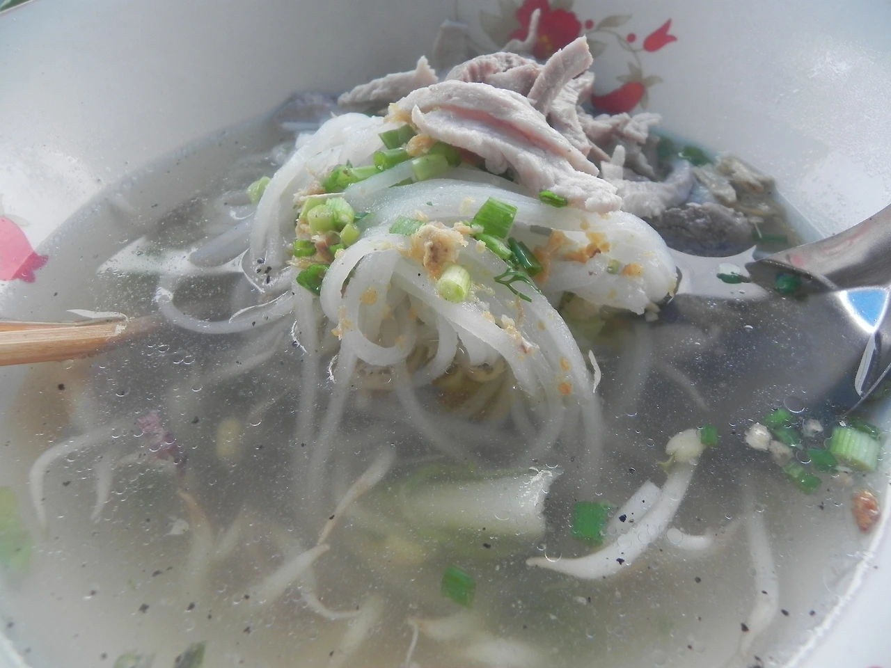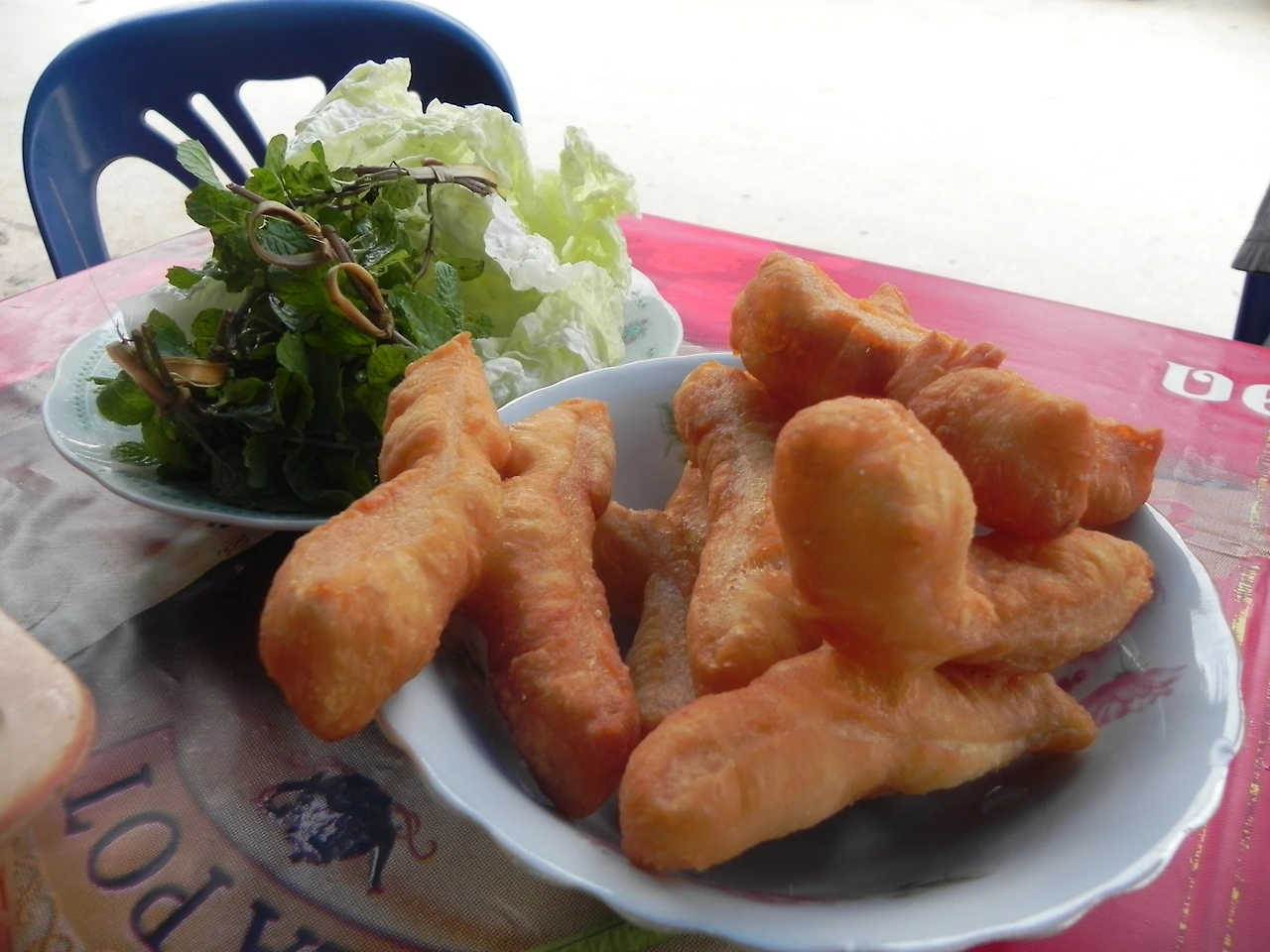 우리는 아침식사를 위해 발걸음을 옮겼다. 우리가 머문 숙소는 조마베이커리 바로 옆 골목 안쪽에 있었는데, 조마가 있는 큰길 반대편으로 내려가면 바로 메콩강이 나온다. 강가로 나오면 오전에만 문을 여는 식당이 하나 있다. 그곳에서 우리는 쌀국수와 죽을 주문했다. 그런데 꽈배기 같은 빵이 가득 찬 그릇과 풀과 반으로 잘라놓은 작은 초록색 과일이 담긴 그릇을 우리에게 먼저 내준다.