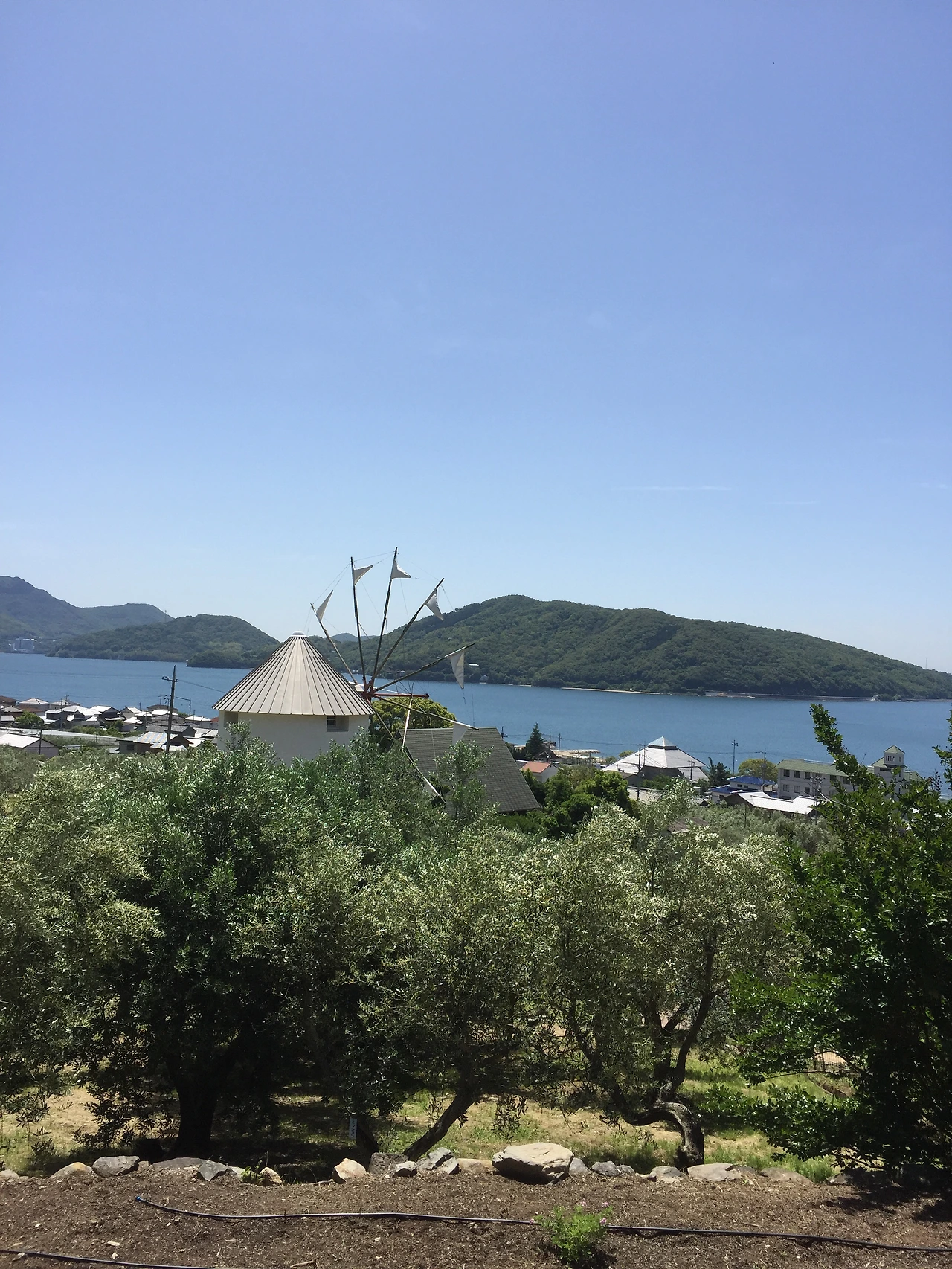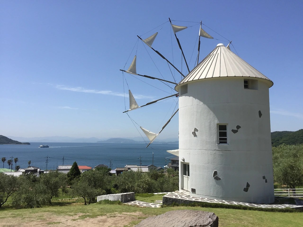 올리브 공원은 말 그대로 올리브 나무가 가득했다. 일본에 와 있다는 느낌보다는, 그리스 어느 섬에 와 있는 기분이랄까? 오래 전 처음 그리스에 갔을 때의 복잡미묘한 기분이 살짝 느껴지기도 했다. (나중에 알고보니 쇼도지마는 그리스 밀로스섬과 자매 섬이라고 한다.) 볼거리가 많다기보다는 이국적인 풍경 덕분에 여행객들이 꽤 많았다. 대부분 사람들은 산토리니 섬에서 봄직한 하얀 풍차 앞에서 사진을 찍거나, 빗자루를 빌려 <마녀 배달부 키키>의 한 장면을 연출한다. 빗자루샷은 친절한 관계자분이 능숙하게 사진을 찍어주시니 잘 나올 것 같았다. 난 <마녀 배달부 키키>를 보지 않았기에 빗자루샷은 패스하고, 하얀 풍차 사진 몇 장을 찍고 주변을 산책하는 것으로 만족했다. 올리브 나무 사이로 부는 바람을 맞으며 산책하는 기분이 꽤나 좋았으니까.
