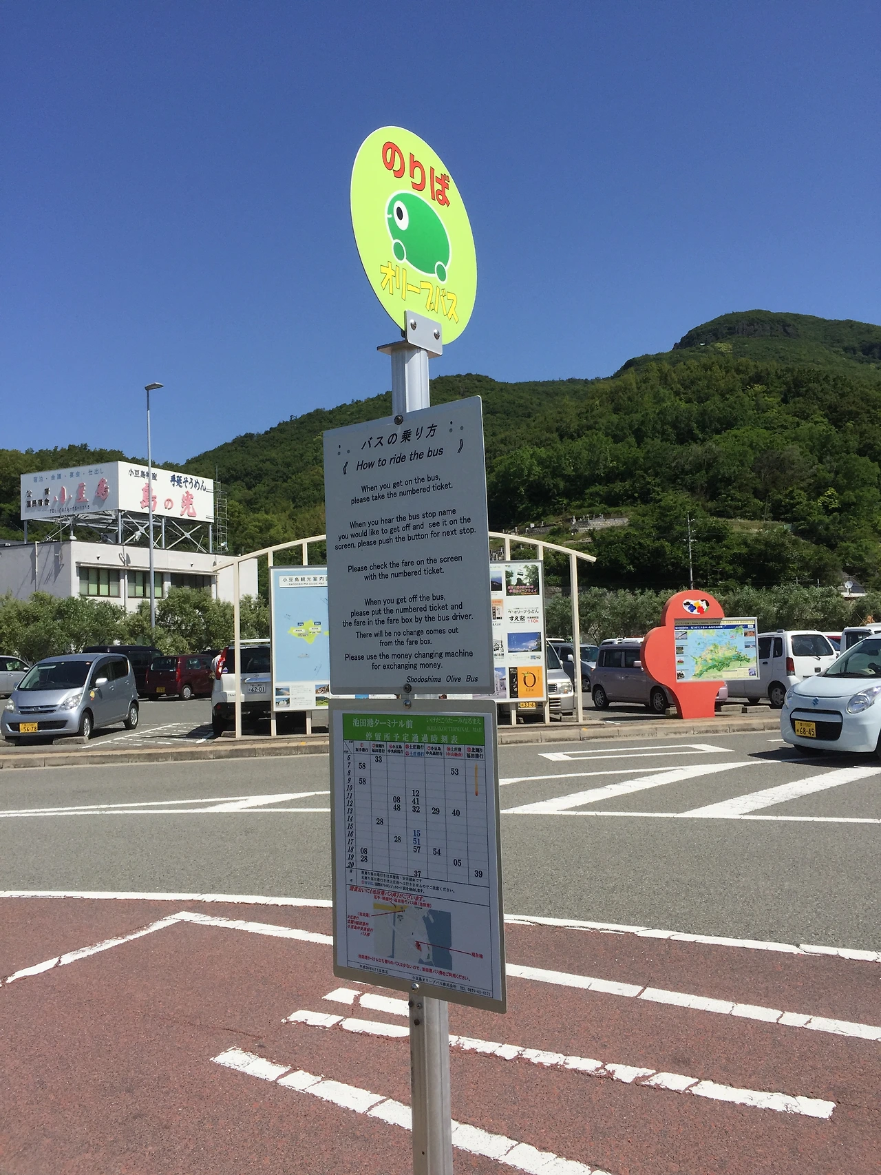 쇼도지마에서는 '올리브 버스'라는 게 있어서 그걸 타고 이동하면 된다고는 들었지만, 정작 요금은 어떻게 내면 되는 건지 거스름돈은 주는 건지 아는 게 하나도 없었다. 그래서 항구 매표소 직원에게 물어보니 올리브버스 시간표와 요금 내는 방법을 친절하게 대답해주었다. 보통 버스와 마찬가지로 내릴 때 요금을 내는 거란다. 친절한 직원분 덕분에 무사히 올리브 버스를 타고 올리브 공원에 내릴 수 있었다.