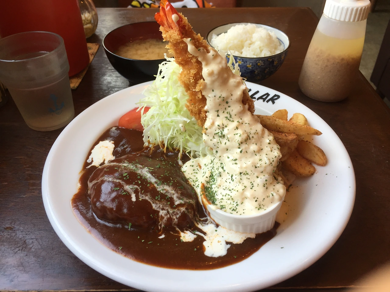 밖이 내다보이진 않는 창가쪽 자리로 안내 받아 메뉴판을 공부하기 시작했다. 영어메뉴판이 없으니 일본어를 한 자 한 자 읽어가며 메뉴를 익혔다. 이 곳은 정해진 단품 메뉴도 있었지만, 이래저래 조합이 가능한 세트메뉴들도 있어 한참을 들여다보다 점심메뉴를 결정했다. 세트를 주문하면 밥과 미소가 포함되어 있고 100엔을 추가하면 후식으로 커피나 주스를 마실 수 있었다. 내가 주문한 메뉴는 함박스테이크와 새우튀김 조합. 잠시후 폭발적인 비주얼의 나의 점심메뉴가 등장했다.