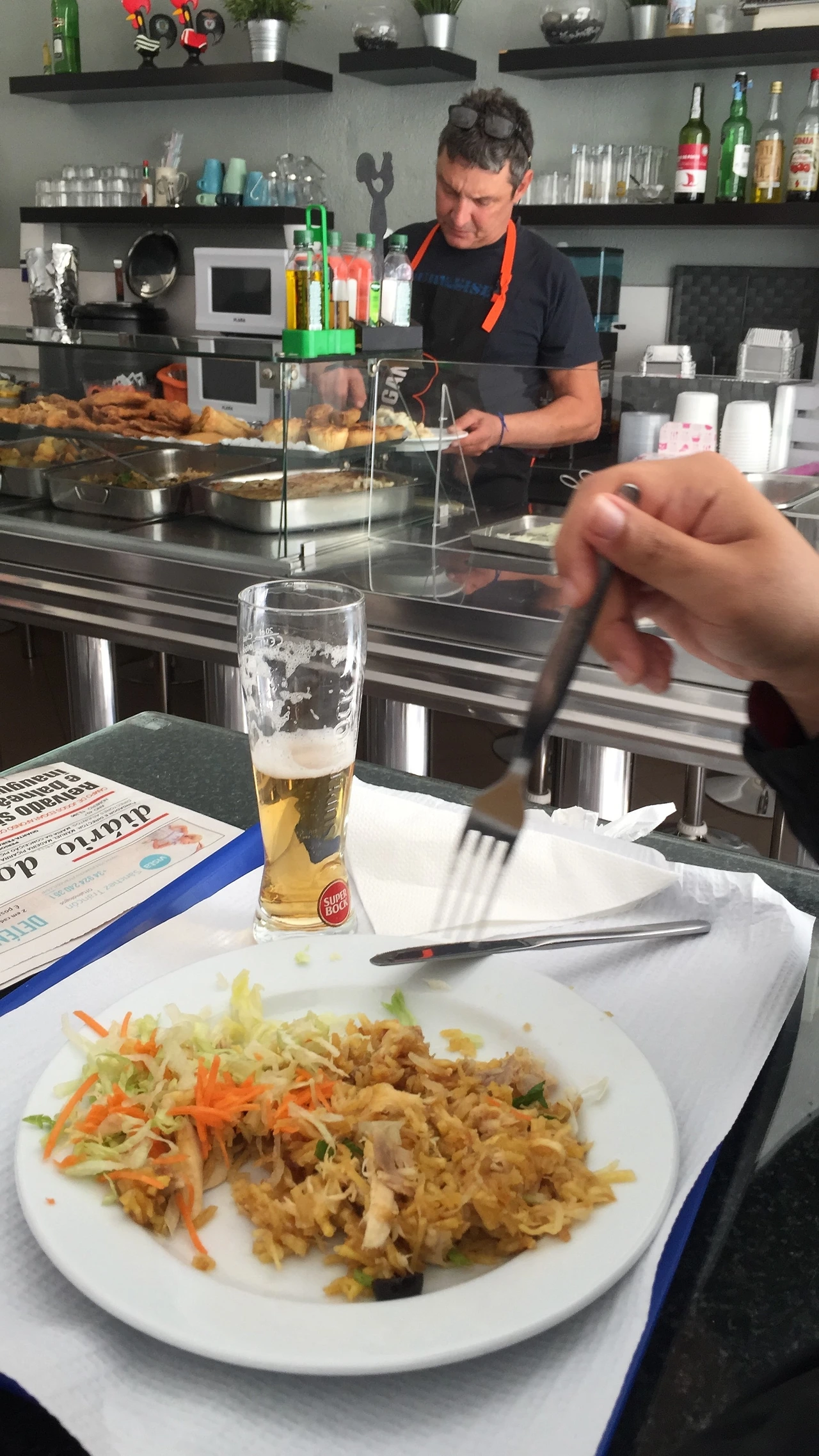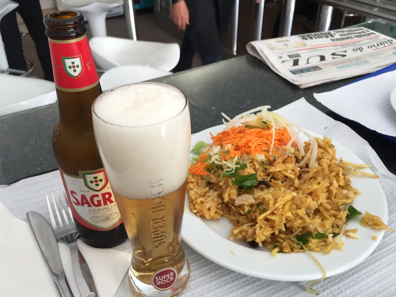 난 신난 발걸음으로 가게로 들어섰다. 가게는 1, 2층으로 이루어져 있었다. 우린 1층 바 앞 테이블에 자리를 잡았다. 메뉴는 바깔라우를 비롯한 몇가지가 있었는데 바에서 보면서 고를 수가 있었다. 현지인 식당이라 당연히 영어메뉴판은 없고 어디서 왔냐고 물어보며 주인아저씨가 영어로 메뉴를 설명해주셨다. 우리가 고른 것은 치킨과 쌀로 만들어진 포르투갈 전통음식(나중에 알고보니 Frango à Brás라는 요리였다), 그리고 식사에 빠질 수 없는 맥주 한 병씩을 주문을 하고 자리에 앉았다.