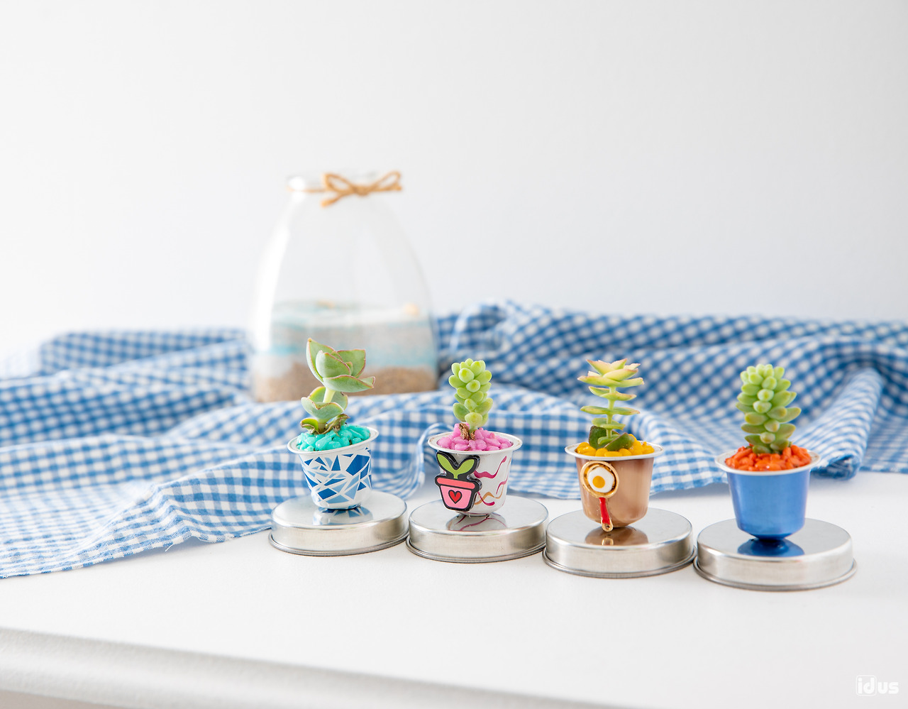 대신 사용된 캡슐 숫자는 그대로 폐기물의 증가로 이어진다. 커피 캡슐에 다육 식물을 심어 미니 화분으로 재탄생시키는 체험 공간.