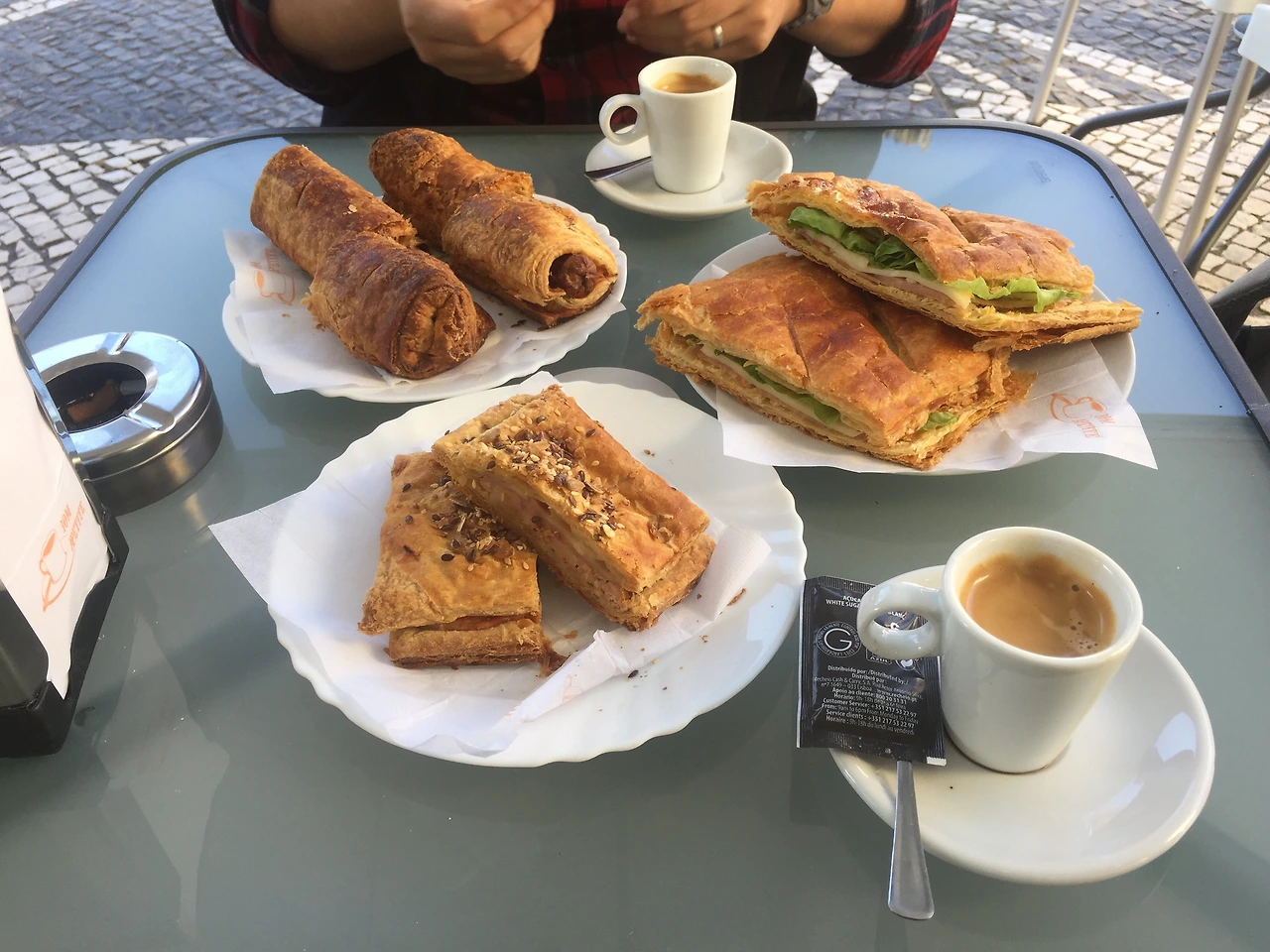 앙드레Andre라는 이름의 이 빵집Pastelaria에는, 점심과 저녁 사이의 애매한 시각임에도 사람이 꽤 있다. 우리는 각각 카페 한 잔씩, 그리고 다섯 개에 3유로 하는 빵을 주문하고, 가게 앞에 내어놓은 테이블에 앉았다. 주문한 빵들은 금세 나왔는데, 그런데 맛있어보여서 내가 골랐던 소시지 끼운 빵이 무척이나 짜다. 소시지는 뭔가 뭉개지는 식감이고 말이다. 심각하게 짠 걸 억지로 다 먹고 나서 생각해 보니, 아무래도 수프랑 같이 먹었어야 하는 모양이다. 배는 채웠지만, 뭔가 아쉽다.
