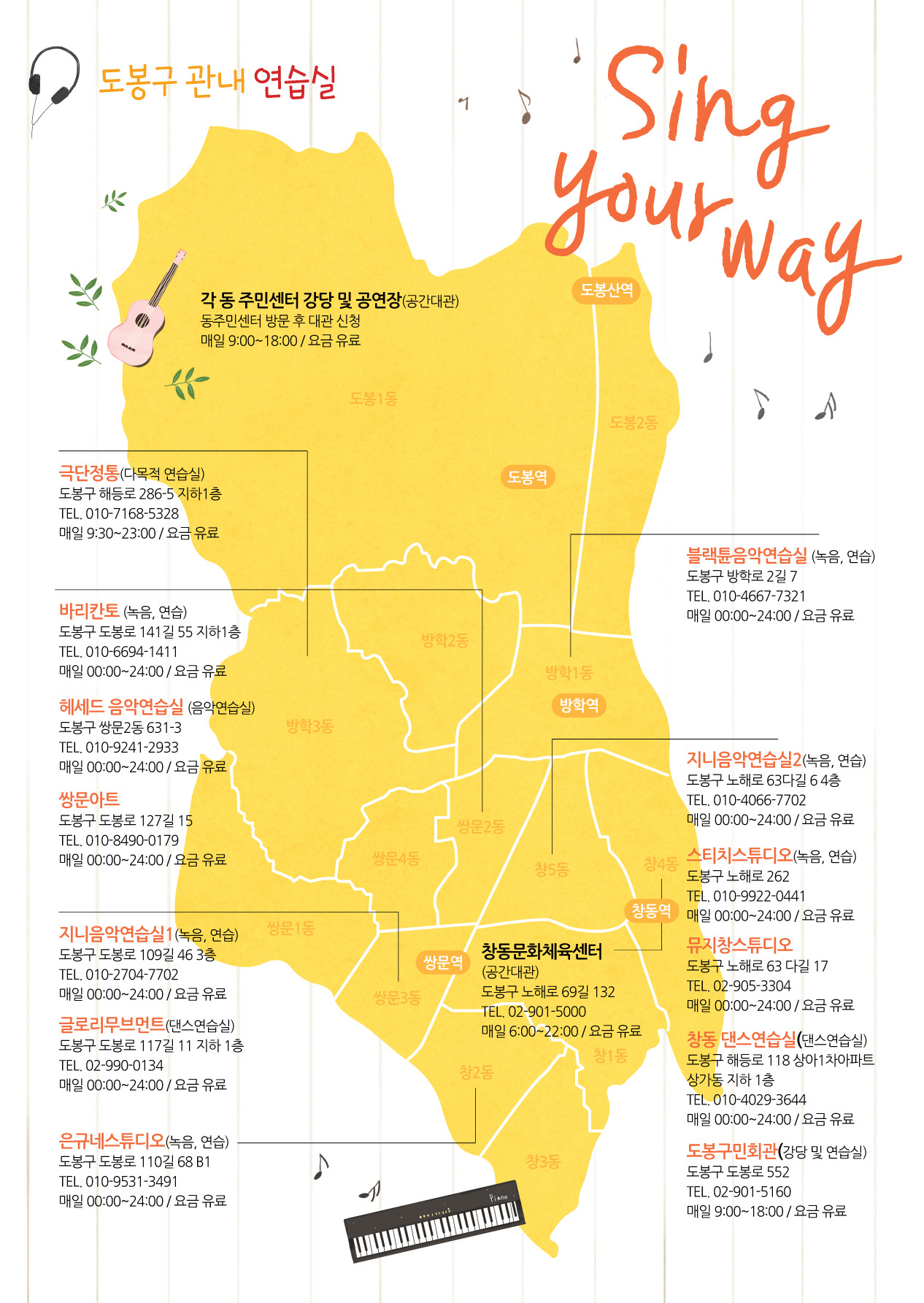 도봉구에 있는 관내 연습실을 지도로 깔끔하게 배치하고,