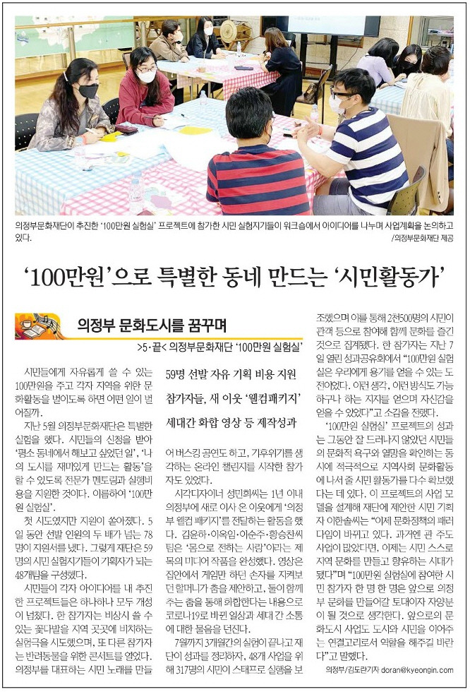 의정부문화재단(대표 손경식)은 지난 6~7월 두 달 동안 의정부 전역을 들썩이게 만든 문화도시 100만원 실험실(이하 백만원실험실) 사업이 성공적으로 마무리되었다고 밝혔다. 백만원실험실은 ‘
