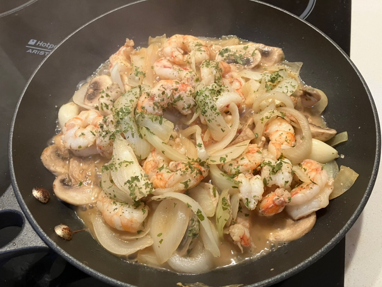 5. 새우와 채소가 익으면 파슬리나 바질 같은 아무런 허브를 흩뿌려서 완성! 아무런 허브가 없으면 그냥 먹자.