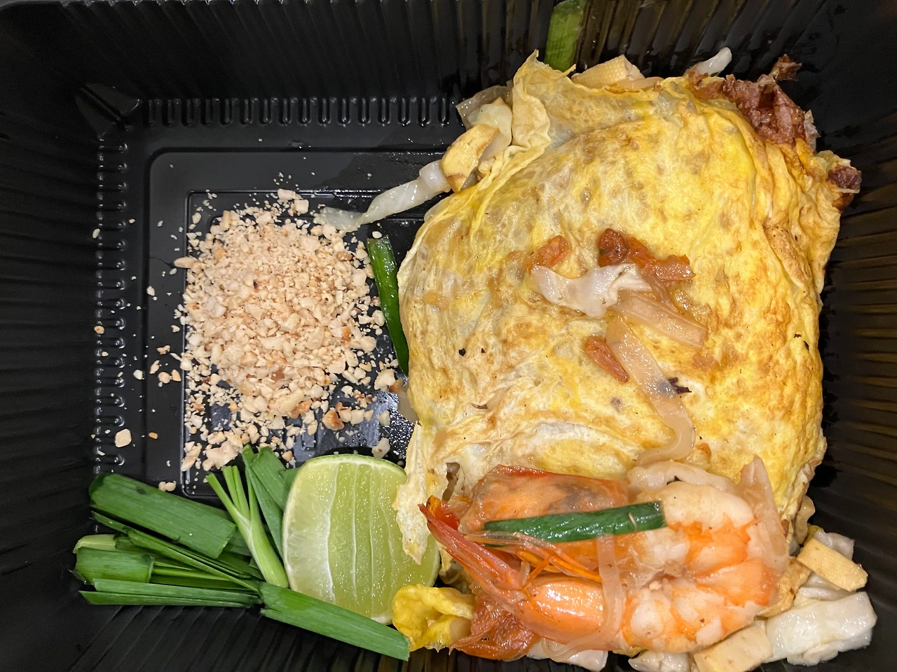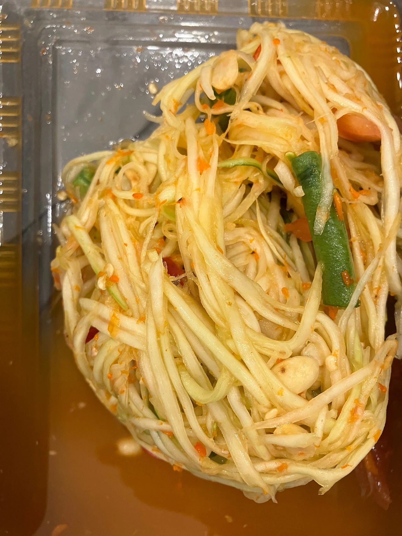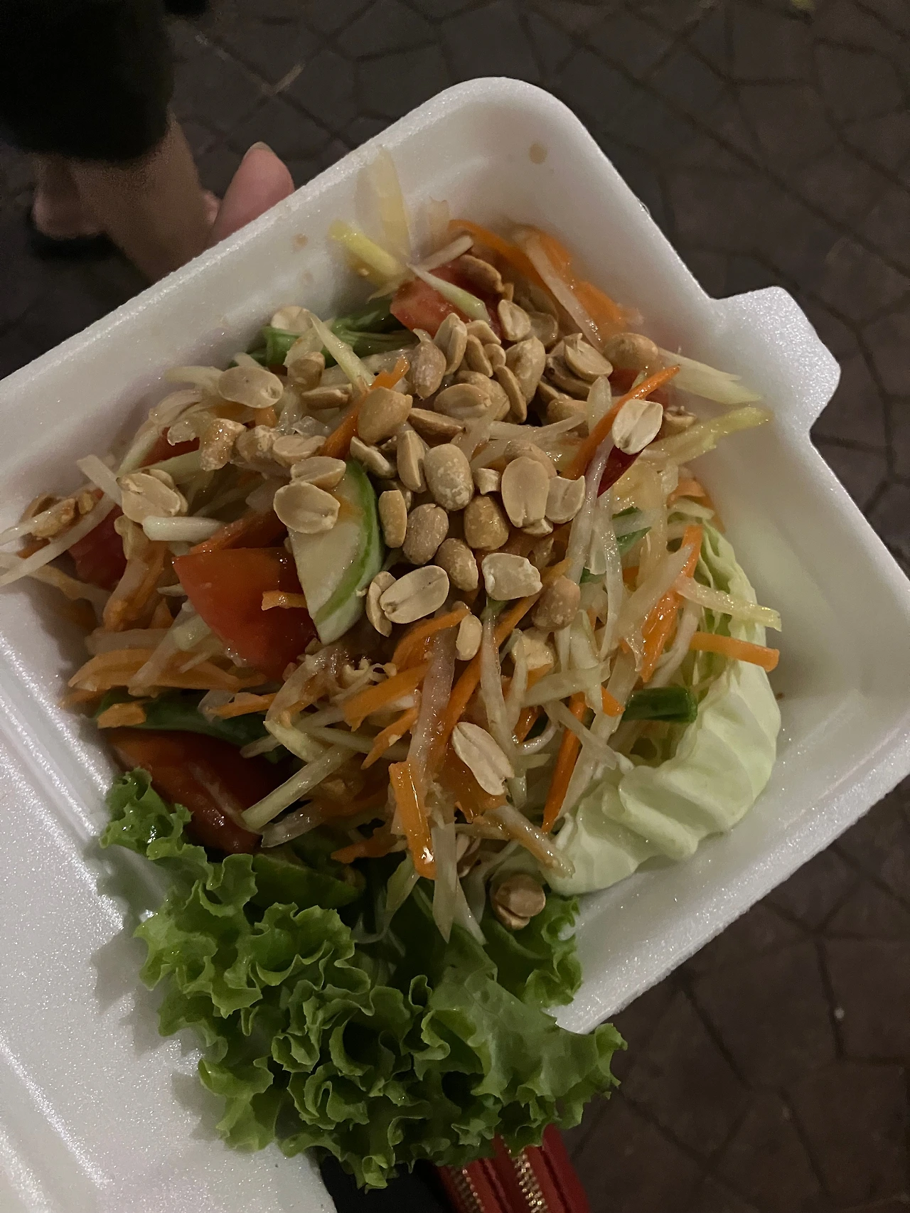 '나와 팟타이'는 카오산로드에서는 조금 떨어진 곳에 위치해 있지만, 그럼에도 사람이 많았던 식당이었다. 우리는 포장을 해다가 먹었는데, 음식을 기다리는 동안 앉아 있으라면서 우리에게 의자를 내어주기도 했다. 음식을 기다리는 동안 근처에 있는 노점식당에서 쏨땀을 포장해서 나중에 함께 먹었다. 그 때 먹은 쏨땀이 이번 여행 중 최고의 음식이었던 것 같다. 물론 '나와 팟타이'에서 포장했던 돼지고기 덮밥과 새우 팟타이도 푸짐하고 맛있어서 정말 만족스럽게 먹었다. (음식 가격 60-70밧)