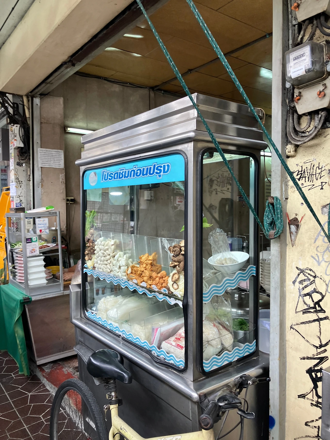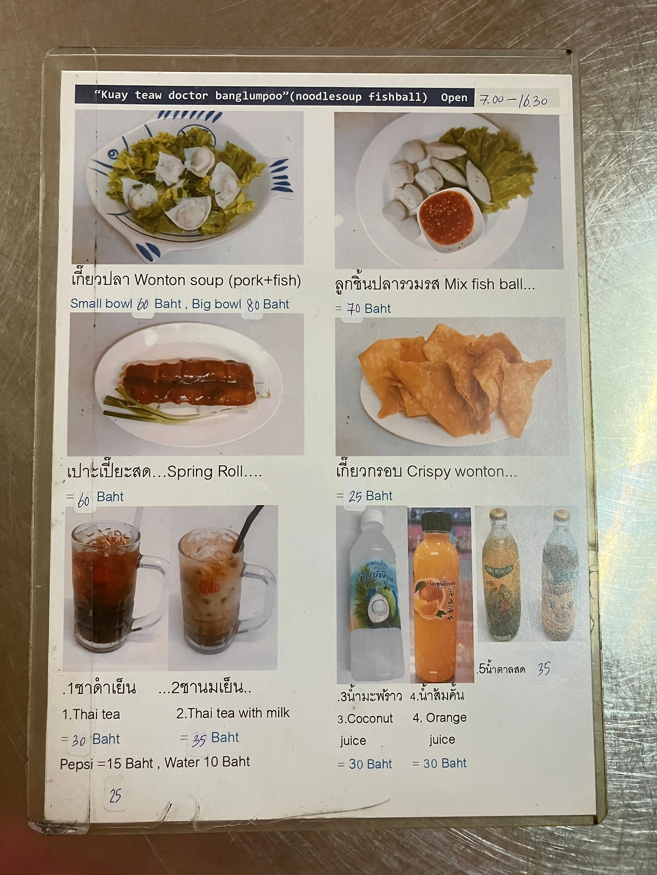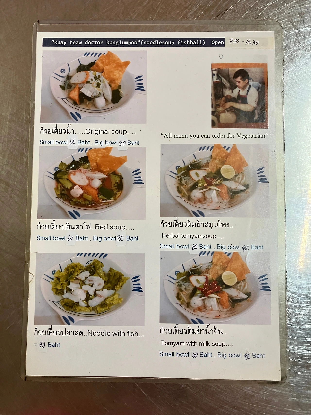 어느 날 같이 여행했던 친구가 어묵국수로 유명한 '찌라 옌타포'에 가보고 싶다고 해서 찾아갔다. 그런데 하필 그 날 문을 닫는 바람에, 맞은편에 있는 가게로 들어가 앉았다. 바로 '닥터 어묵국수'라는 이름의 식당인데, 개인적으로는 '나이쏘이'만큼이나 오래 전에 방문했던 가게였다. 예전에 찾아왔을 때에는 영어 메뉴판도 없어서 대충 손짓 발짓으로 주문했는데, 이번에 다시 찾아가 보니 그새 영어 메뉴판이 생겨 있어서 수월하게 주문할 수 있었다. 하지만 새로 생긴 영어 메뉴판 말고는 가게 분위기도, 심지어 국수와 국수 그릇까지도 예전과 달라진 것이 별로 없어서 반가운 마음이 더욱 컸다. 메뉴는 거의 어묵국수 종류인데, 각각 원하는 국물을 선택할 수 있다. 오리지널은 순한 편이지만, 똠얌 국물의 경우에는 생각보다 꽤 매워서 땀을 흘리며 먹어야 할 정도이다. 나는 다음에도 다시 찾아갈 가게이겠지만, 이 곳은 향신료가 꽤 쎈 편이라서 어쩌면 보통의 한국 사람 입맛에는 호불호가 다소 있을 것 같다는 생각이 들었다. (어묵국수 60밧)