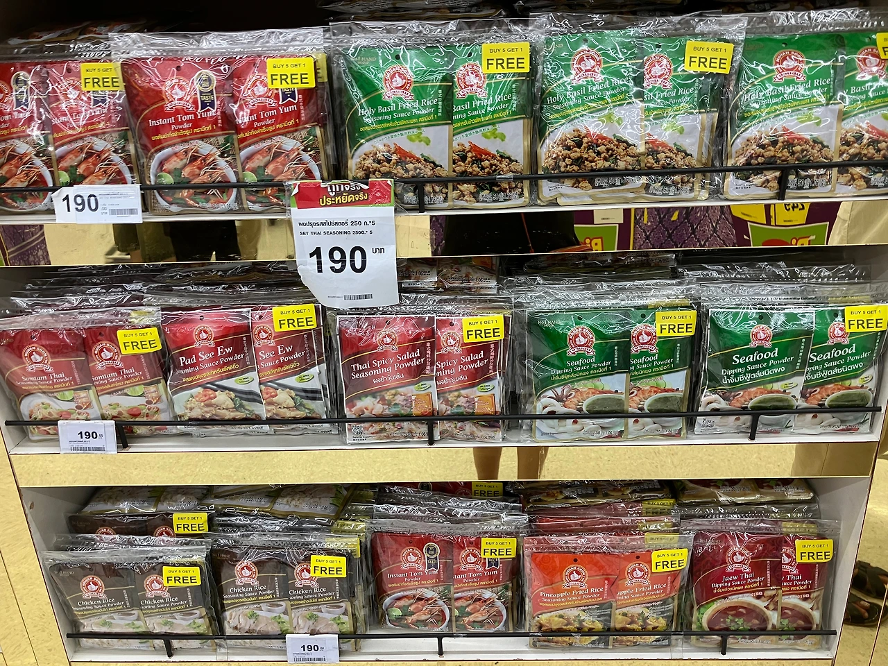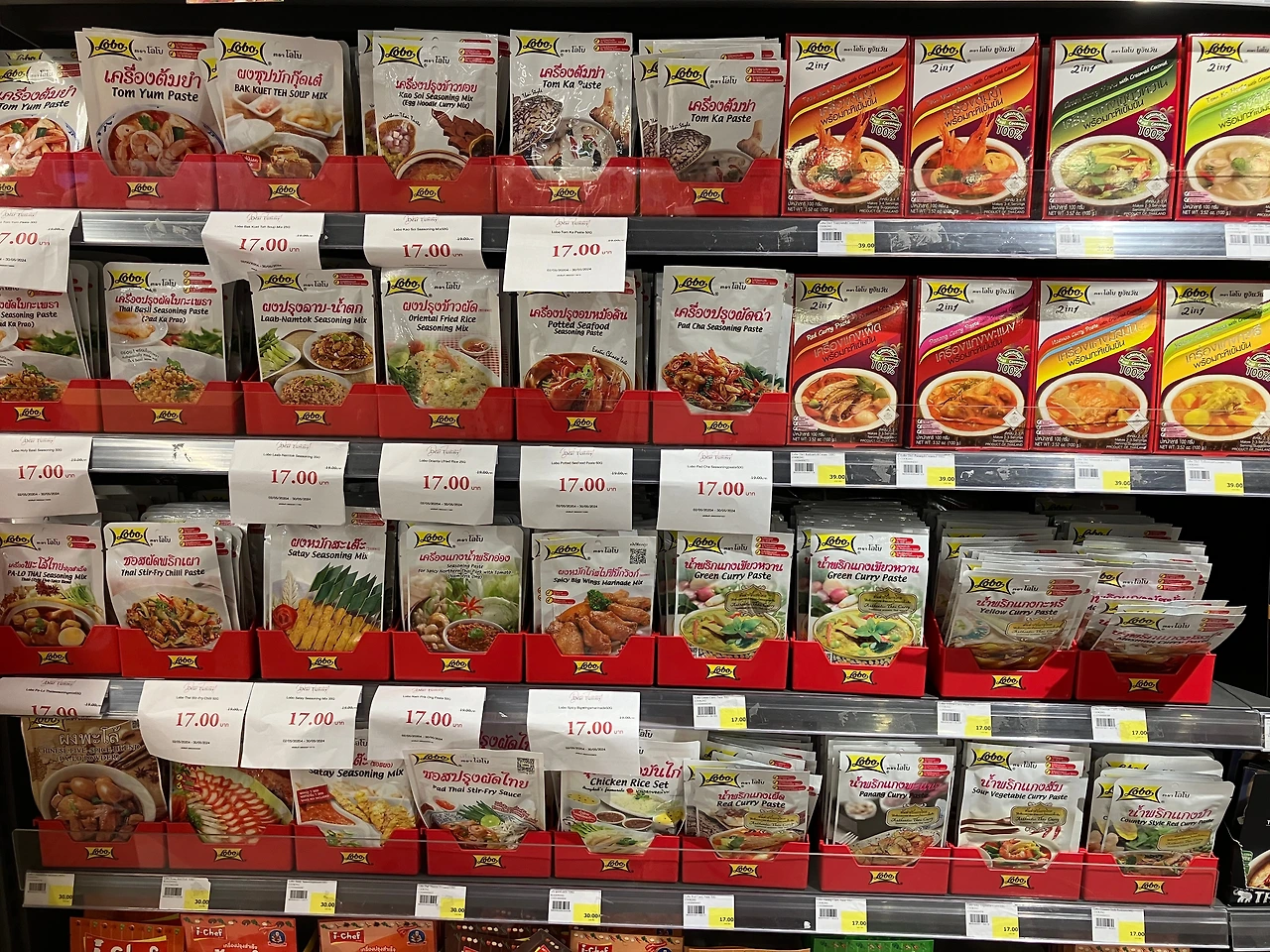 방콕의 별명 중 하나가 바로 미식의 천국이다. 여행 중에 태국의 음식을 먹다 보면, 한국으로 돌아가 집에서도 한번 요리해서 먹고 싶다는 생각을 하게 되는 순간이 찾아온다. 하지만 향신료 등 여러 가지 원재료들을 직접 구매하는 것은 우리에겐 좀처럼 쉬운 일이 아니다. 어떻게 제조해야 할지도 막막하고, 심지어 한국에 통관 신고를 해야 하거나 아예 반입이 금지되는 경우도 있기 때문이다. 그런 여행자의 억눌린 욕구를 충족시켜줄 수 있는 다양한 소스들은 슈퍼마켓이나 마트에서 얼마든지 찾아볼 수 있다. 그린커리, 똠양꿍, 팟타이 등은 페이스트 형태로 판매하고 있으니, 요리를 좋아한다면 구입해보면 좋을 것 같다. 가격도 정말 싸다. (가격 20밧 안팎)