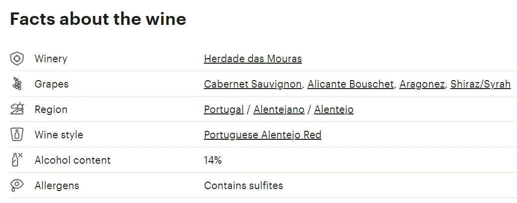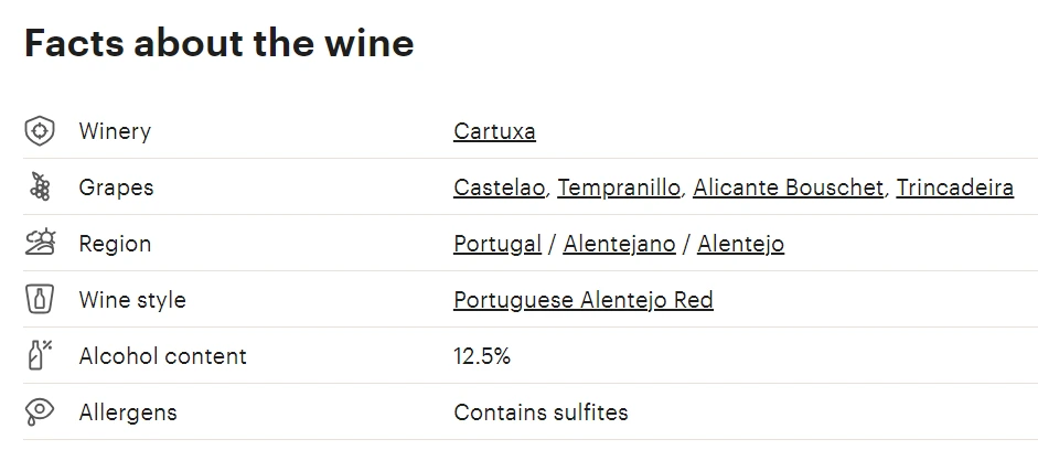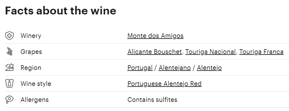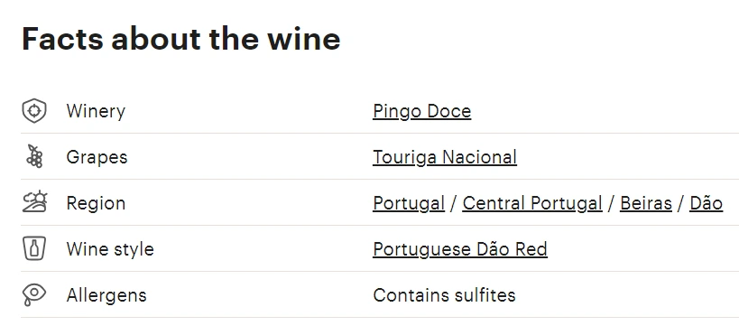 리스보아(Lisboa) 지역은 포르투갈에서 두 번째로 큰 와인 생산지이다. 테이블 와인을 뜻하는 '비뉴 다 메사(vinho da mesa)'를 만드는 것으로 유명하다. 화이트와인은 Arinto, Fernão Pires 및 Malvasia 품종을 생산하고, 레드와인은 A licante Bouschet, Castelão, Touriga Nacional 및 Aragonez 품종을 생산한다고 한다. 대체로 모난 구석 없이 밸런스가 잘 맞춰진 편이다.