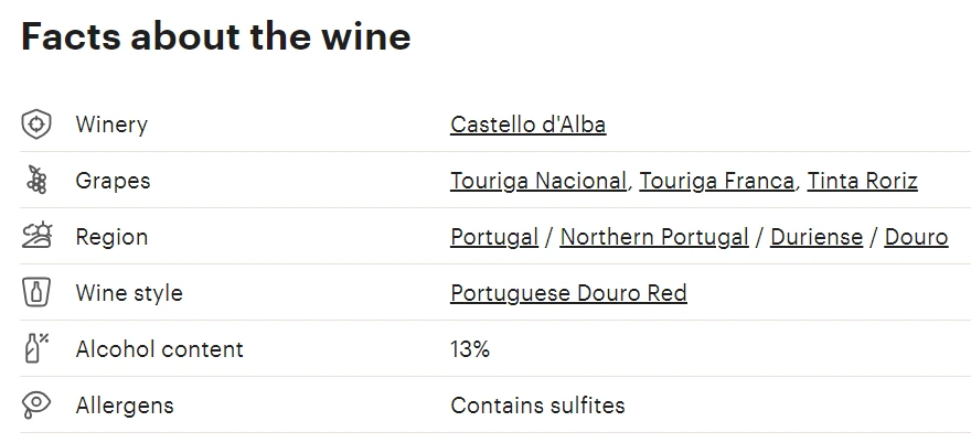 도루강 유역에 있는 포르투(Porto)+도루(Douro) 지역은 세계에서 가장 오래된 와인 산지 중 하나이고, 포트 와인뿐만 아니라 고품질의 레드 및 화이트 와인 생산으로도 유명한 지역이다. 특히 레드와인은 일반적으로 충분히 탄닌을 느낄 수 있는 강렬한 풀바디이며, 잘 익은 검은 과일 향과 향신료, 꽃 향이 두드러지는 점이 특징적인 편이다.