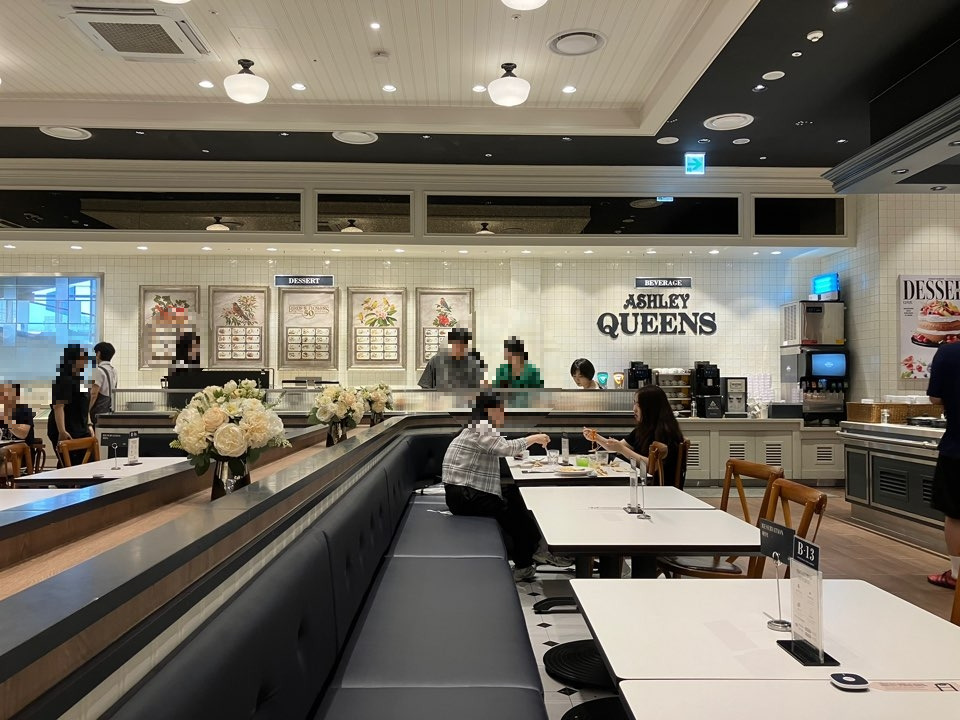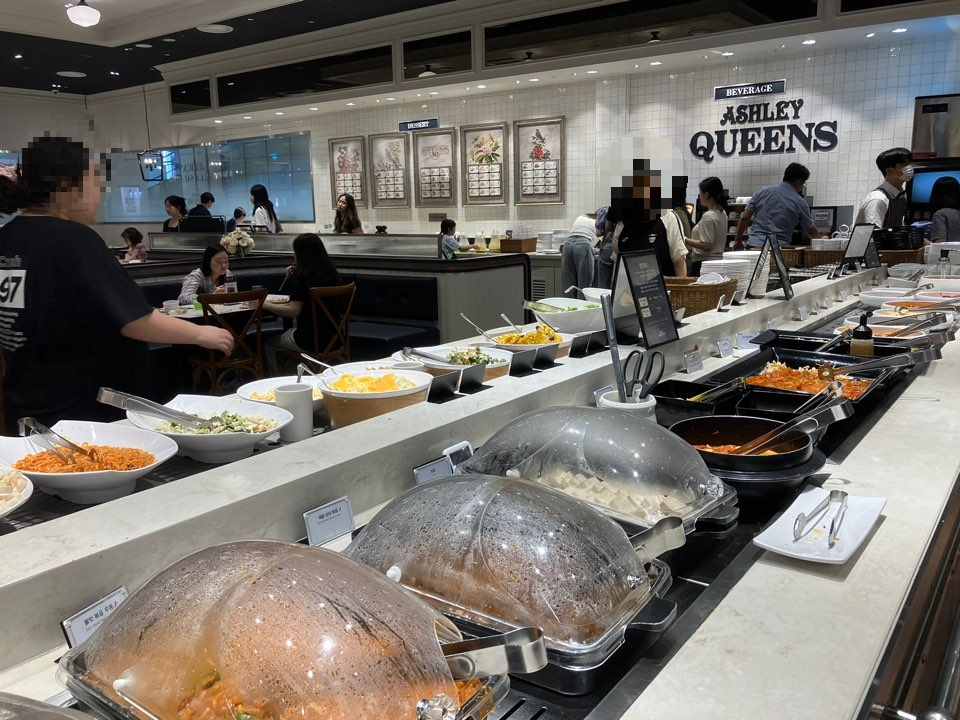 그런데 오랜만에 뷔페에 갈 기회가 생겼다. 바로 엄마의 생신 기념 식사 자리였는데, 평소 소식좌인 엄마는 조금씩 여러 가지 드시는 걸 원하셔서 뷔페가 적격이었기 때문이다. 날씨가 더우니 어디 돌아다니고 싶진 않으니 쇼핑몰이나 백화점 안에서 해결하기로 했고 그렇게 낙점된 곳이 의정부 신세계 백화점 안에 있는 애슐리였다. 의정부 애슐리는 생긴 지 얼마 되지 않아서 아직도 많은 사람들이 찾고 있는 것 같았다. 우리가 갔을 때에는 평일 디너가 시작되는 시각이었는데 이미 대기하는 사람들이 많이 있었다. 엄마를 기다리게 하기는 싫어서 미리 예약하고 방문을 했더니 시간에 맞춰 바로 입장할 수 있었다.