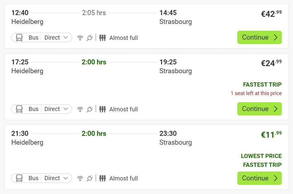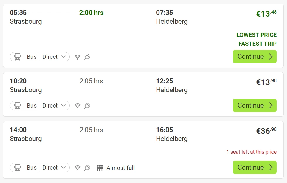 근교로 다녀오기에 어디가 좋을까 찾아보던 중, 문학과 철학에 관심이 많은 고래군이 평소 가보고 싶어 했던 하이델베르크에 다녀오기로 했다. 스트라스부르에서 하이델베르크로 당일 여행을 하는 사람은 많지 않은 모양인지 교통편이 조금 애매하긴 했다. 비행편은 딱히 없고, 기차가 있지만 여러 번 갈아타야 했다. 더 편한 방법이 없을까 찾아보다가 스트라스부르에서 출발해 하이델베르크까지 한번에 가는 플릭스 버스를 찾아냈다. 역시 유로라인, 아니 이제는 플릭스 버스다.