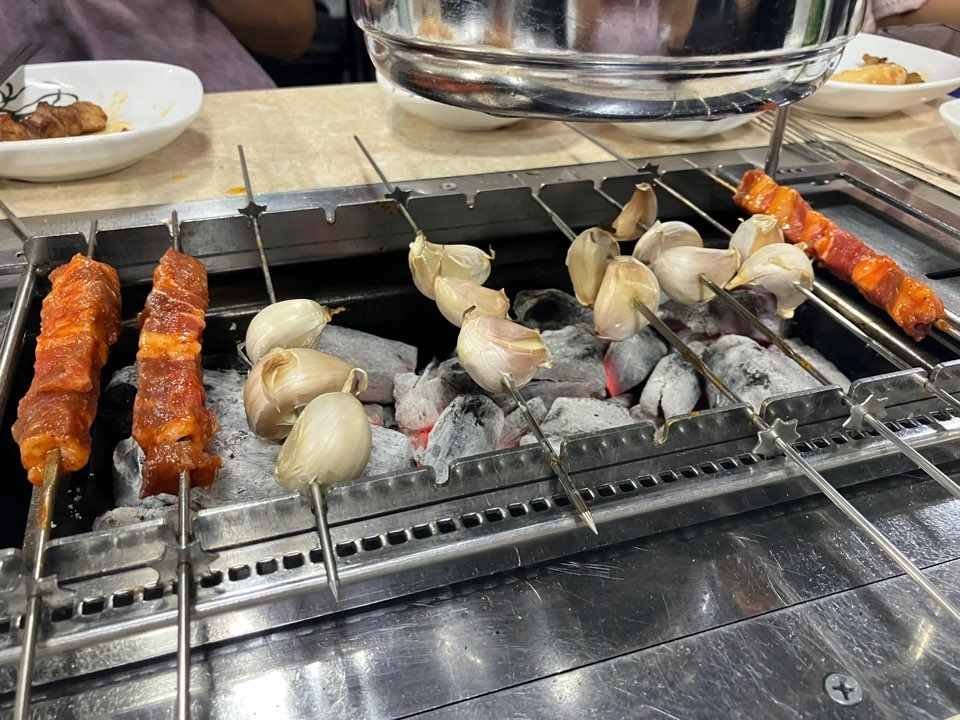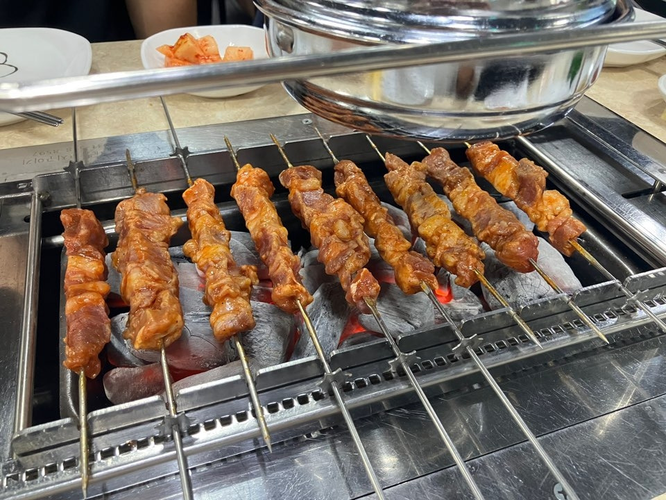 곧이어 양꼬치를 구울 불이 들어오고 양념 된 양꼬치가 나왔다. 처음 먹으러 왔을 땐 양꼬치 양념 맛이 강해서 양고기 맛은 잘 느껴지지 않아서 양고기 입문자나 초보자가 좋아할 것 같다는 생각을 했었다. 이번에도 양꼬치 맛은 크게 변하지 않았고 가격만 변했다.(1인분 16,000원) 빨간 양념이 묻는 양꼬치를 돌돌 굴려가면서 굽는데, 에어콘이 켜져 있었음에도 불구하고 날씨가 습하고 더워서 불판 앞에 있으려니 너무 덥다. 그리고 가게 내부에 손님이 많으니 친구들 목소리도 잘 들리지가 않았다.