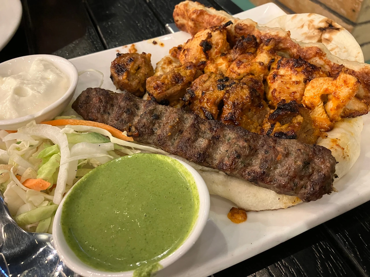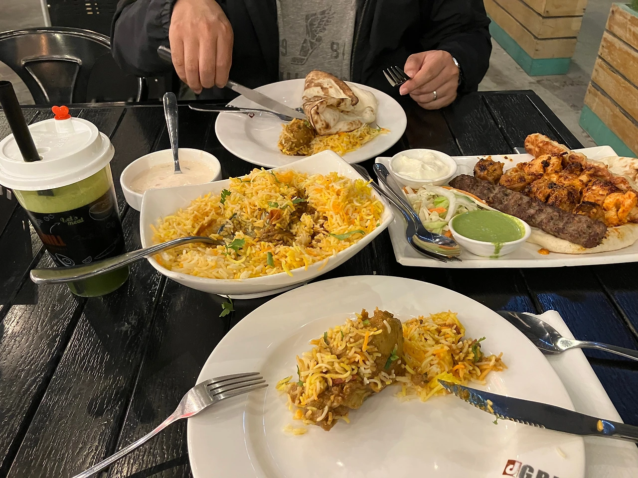 비교적 부담없는 가격에 메뉴도 정말 다양했다. 그 많은 메뉴들 중에 우리가 고른 것은 '미니 그릴 플래터, 치킨 비리야니, 레몬 민트 주스'였다. 혹시 좀 모라자면 먹어보고 더 시키기로 하고 일단은 주문 완료! 조용한 분위기에서 직원들의 친절한 응대를 받으며 음식을 기다렸다. 곧 주문한 음식들이 나오는데, 음식들과 함께 길고양이들도 우리 테이블로 몰려오기 시작했다. 다수의 경험을 통해 고양이들과 눈을 마주치면 어쩔 수 없이 고기 몇 조각을 헌납해야 한다는 사실을 잘 알고 있었으므로 일부러 최대한 눈길을 주지 않았다.