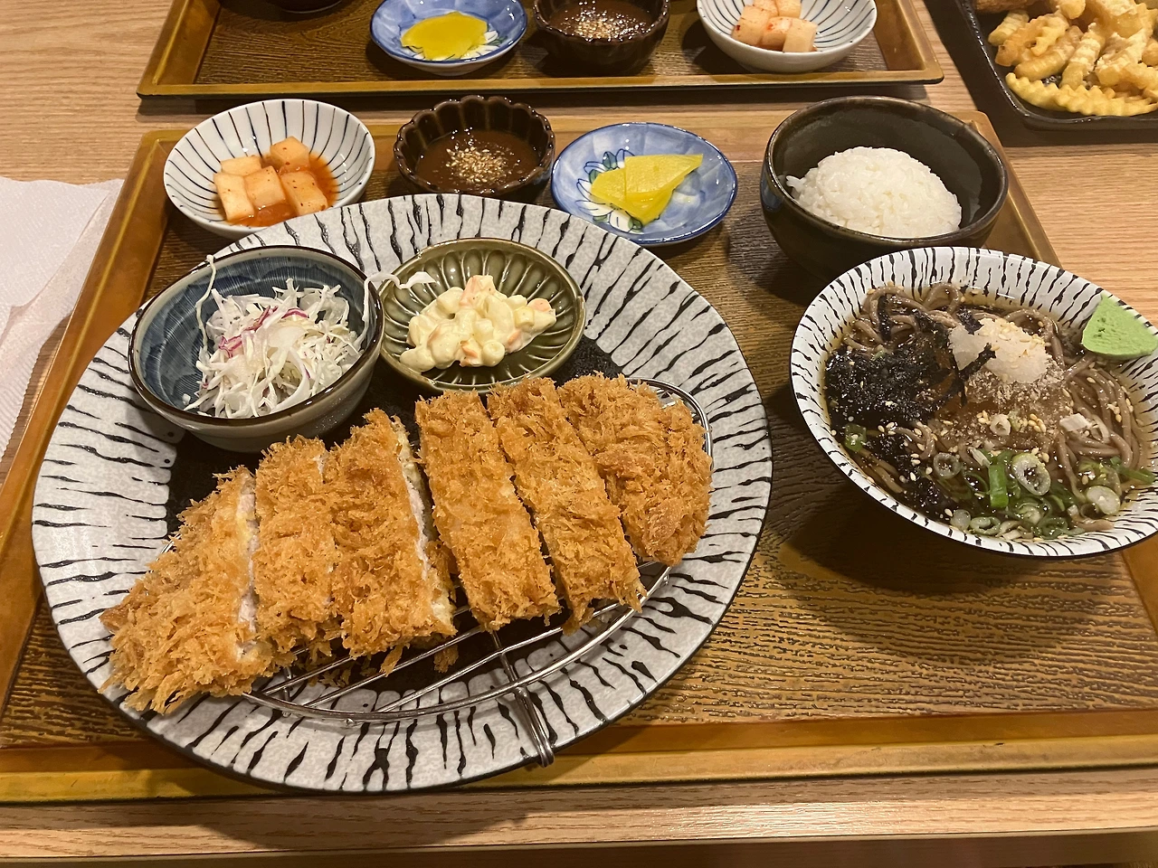 추천 메뉴였던 등심 돈까스(6,900원)를 시키고 모자랄까봐 모듬튀김(3,000원)도 하나 주문을 했다. 모듬튀김은 치즈볼 대신 김말이 튀김으로 나온다고 했다. 곧 주문했던 음식들이 나왔다. 6,900원이었는데 메뉴 구성은 아주 알찼다. 돈까스 외에 미니 우동이나 소바 중에 선택할 수 있어서 밥, 돈까스와 함께 먹을 수 있었다. 반찬은 먹을만큼 조금씩 나왔는데, 가게 안쪽에 셀프바가 있어서 추가로 가져다 먹을 수가 있으니 좋았다.