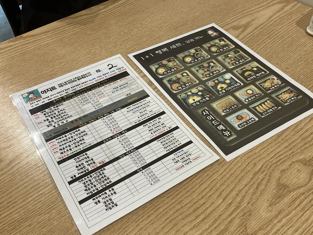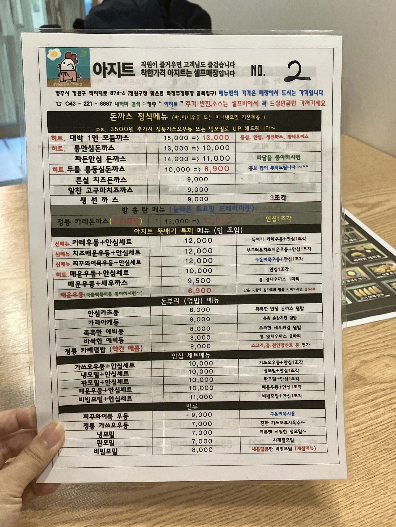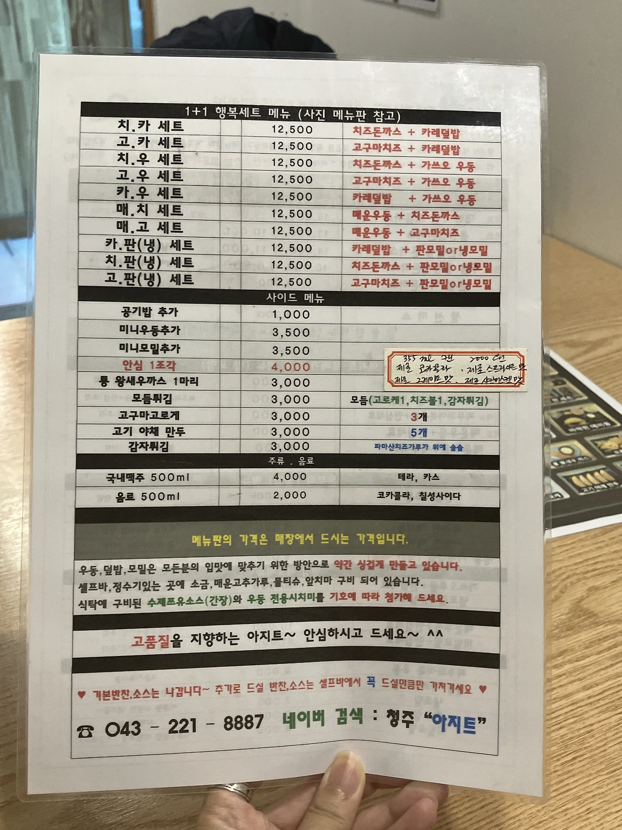 어떻게 할까 고민 끝에 터미널 근처 어딘가를 찾기 시작했고 청주대 터미널 옆 작은 골목에 <아지트>라는 식당을 발견했다. 전시 작품을 설치하고 미술관까지 보고 난 후라 많이 지친 상태에 배도 고파서 뭘 먹어도 좋을 것 같았다. 식당 안으로 들어 섰을 때에는 마침 손님이 아무도 없었다. (점심시간이 많이 지난 애매한 시간이었다.) 돈까스가 메인이었던 메뉴판에는 다양한 메뉴들이 있었고, 그 메뉴들을 조합해서 세트로 판매하고 있었다.