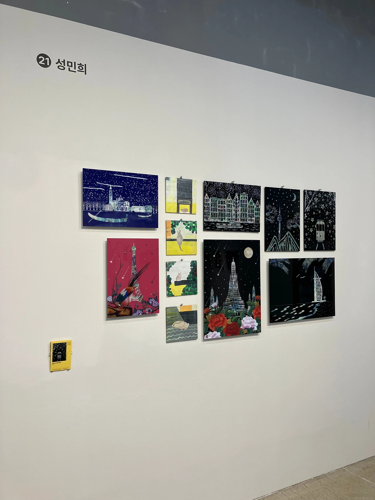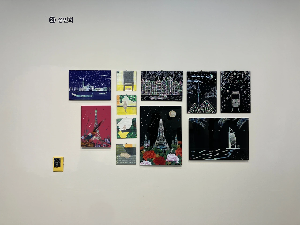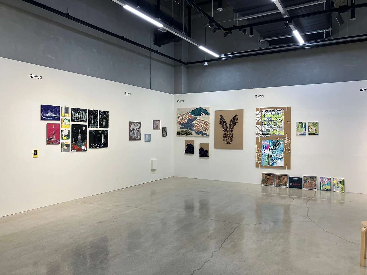 할당된 벽 사이즈에 맞춰서 나름 설치 레이아웃을 정해서 갔는데, 막상 다 설치하고 보니 너무 옹기종기 작품들을 붙어있게 한 건 아닌가 싶기도 하다. 어쩌면 다른 작가들의 영역(?)에 침범하고 싶지 않다는 생각이 너무 강했던 모양인가 하는 생각도 들었다. 암튼 최대한 정성을 들여 작품을 배치하며 걸어 놓고 났더니, 늘 그렇듯이 전시를 할 수 있음에 감사하고 뿌듯한 마음이 슬슬 들기 시작했다. 하지만 그보다는 최근 작품 활동에 게을러진 나에게 아쉬운 마음이 더 크게 들었다.