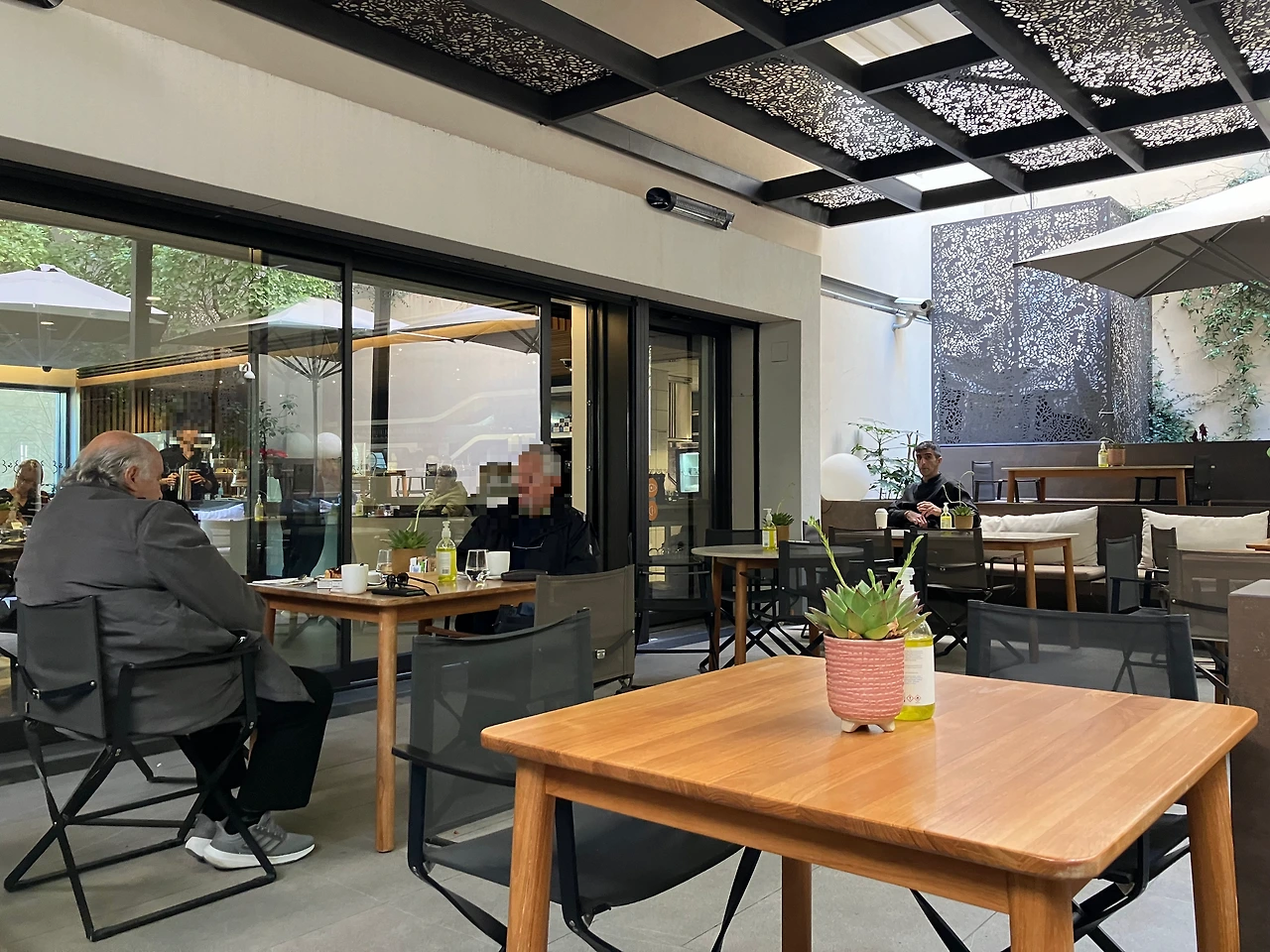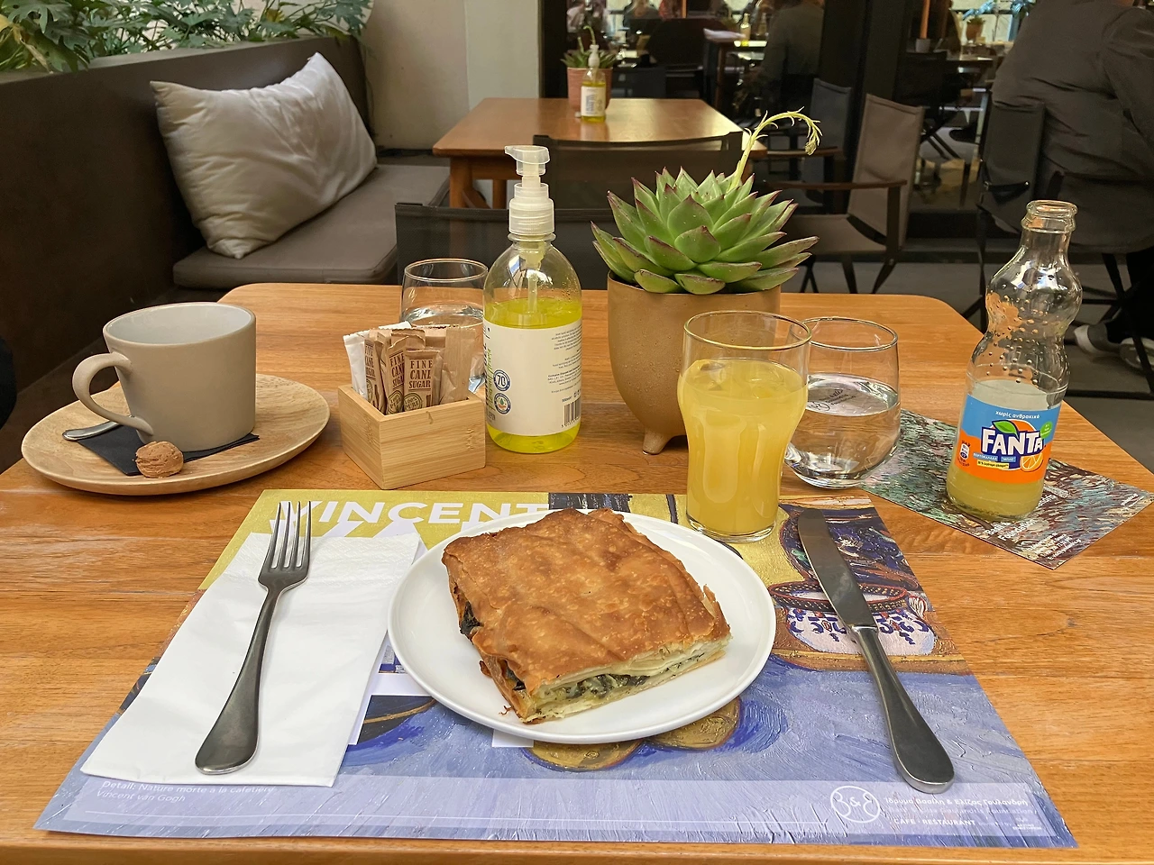 전시를 관람하는 중간에 그 학생들과 동선이 겹쳐서 서로 편하게 관람하기가 힘들어지기도 했다. 그래서 잠시 미술관 카페에서 쉬었다가 나머지를 마저 보기로 했다. 레스토랑을 겸하는 미술관 카페는 전반적으로 깨끗하고 세련된 분위기 덕분에 아주 쾌적하고 좋은 편이었고, 야외 테이블도 있어서 기분과 취향에 따라 전혀 다른 경험을 누릴 수 있는 곳이었다. 몇몇 관람객들은 카페에서 평일 오후의 여유를 즐기고 있었다. 우리도 야외에 자리를 잡고 간단히 먹을 것과 음료를 주문했다. 따뜻한 아메리카노와 시금치 파이, 그리고 병 음료. 다만 아메리카노는 정말이지 너무나도 맛이 없었고, 시금치 파이는 그나마 뭐 그럭저럭이었지만 가격만큼의 만족도는 아니었던 것 같다. 뭐, 분위기 값이라고 생각하기로 했다. (아메리카노 3.5유로, 시금치 파이 6유로)