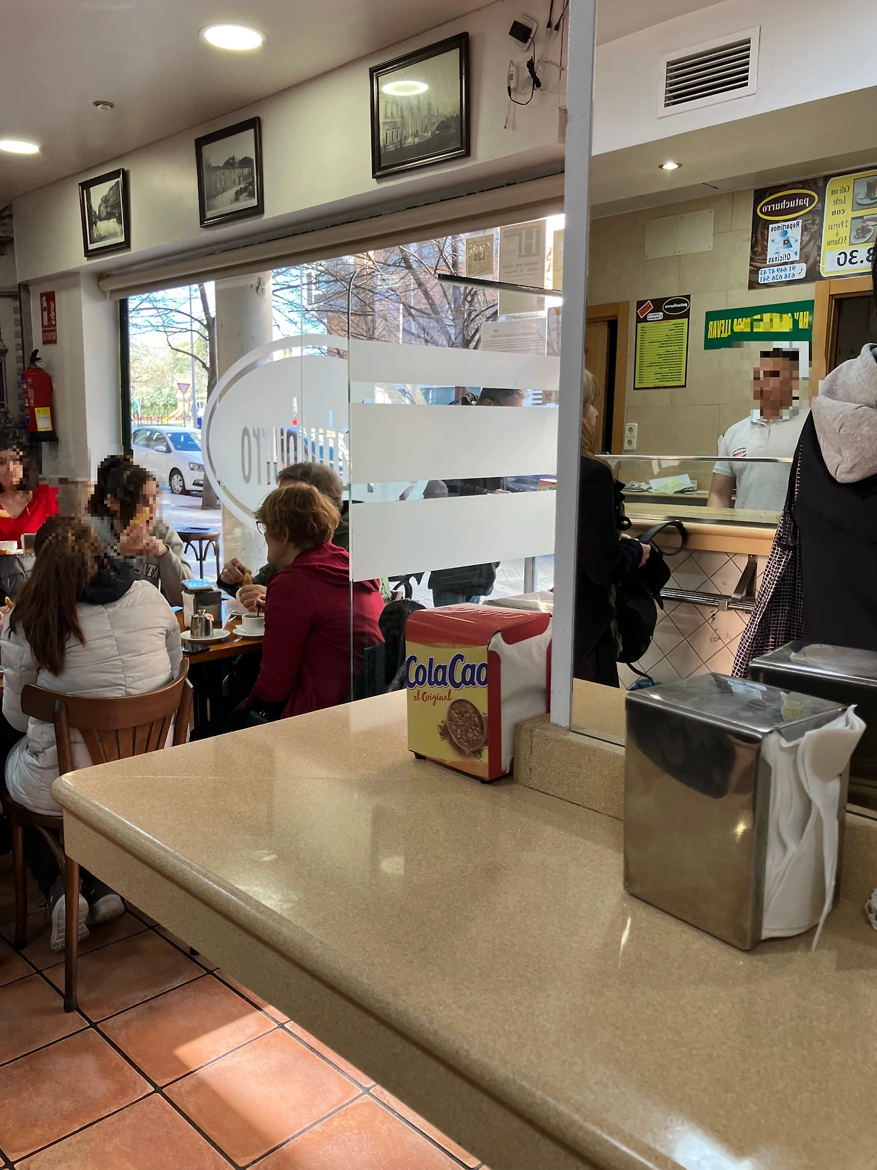 수수한 가게 외관, 내부에 들어서니 그리 크지 않은 공간임에도 손님들로 가득 차 있다. '역시 맛집인 건가?' 하는 생각을 하며 메뉴를 보니, 정말이지 단촐함 그 자체인 데다가 가격까지도 착하다. 정말 다행스럽게도 아는 단어들로 되어 있는 메뉴판을 보면서, 초콜라떼와 추로스 5개 세트(메뉴판 좌측부터 4번째/3.5유로)를 카운터로 가서 주문을 했다. 직원들은 각자 맡은 구역에서 말 그대로 일사분란하게 움직이며 주문한 음식들을 내어주었다.