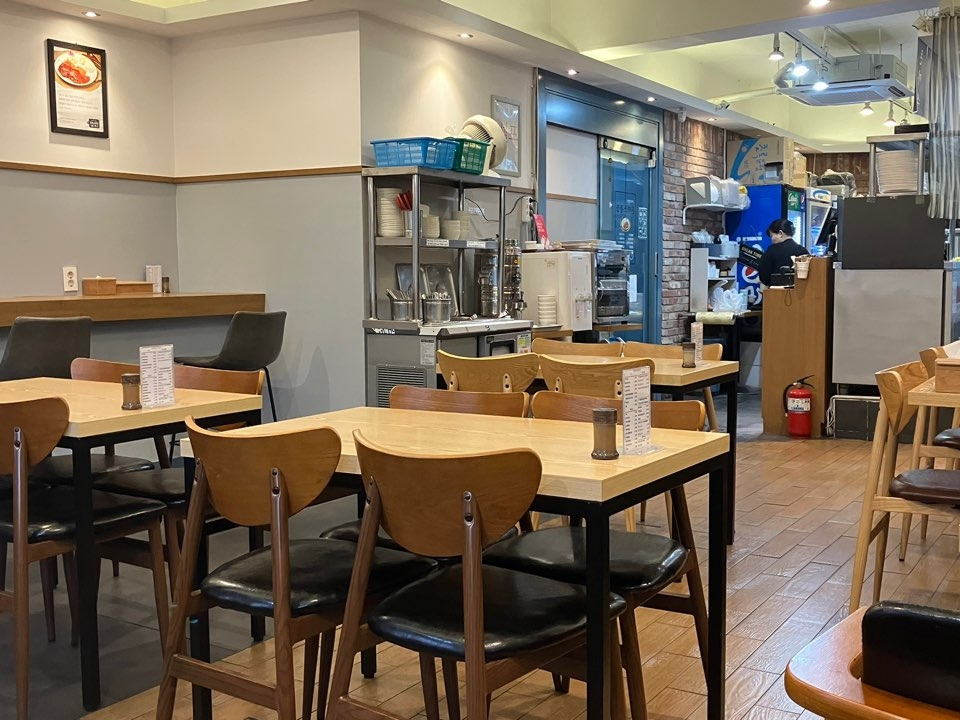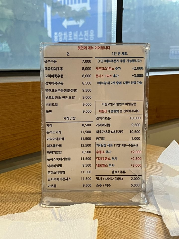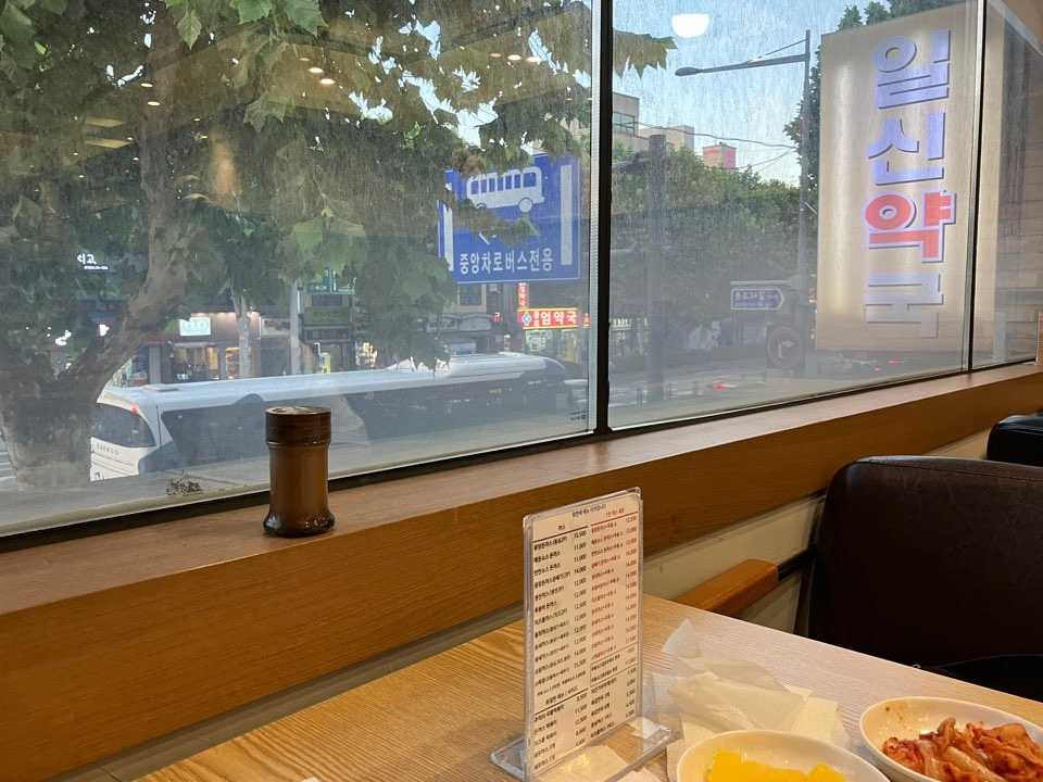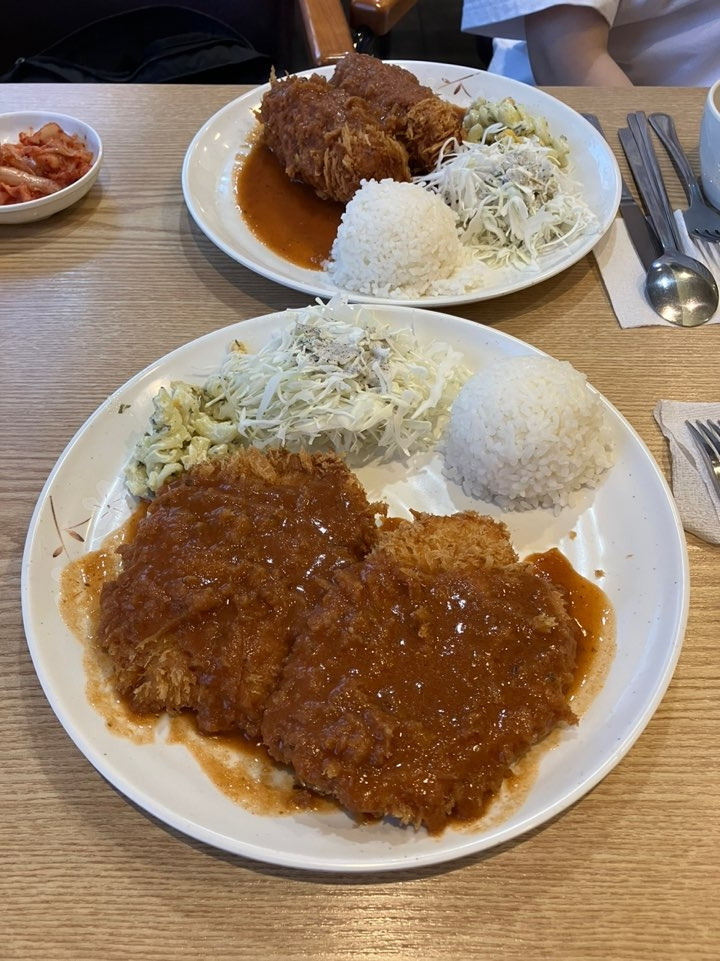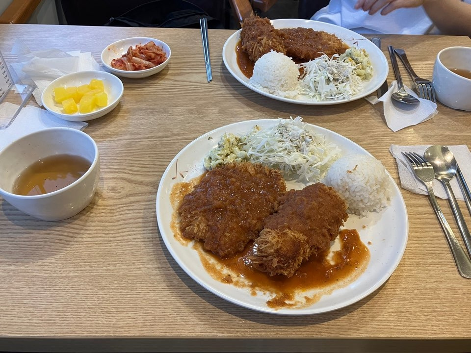 계단을 올라 2층 매장으로 올라갔는데 식사 때가 지나서 그런지 한산한 분위기였다. 창가 쪽에 자리를 잡고 메뉴들을 살펴보니 돈까스를 비롯해서 튀김 종류의 메뉴들이 많이 있었다. 난 먹고 싶었던 돈까스를 주문했고, 잠시 후 돈까스를 받아 들었다. (식전으로 나올 법한 스프는 나오지 않았다.) 돈까스는 상상하는 경양식 옛날 돈까스의 비주얼이었다. 소스가 잔뜩 끼얹어진... 사실 얇디 얇은 고기에 튀김옷, 그리고 흠뻑 적셔진 돈까스 소스. 학교 다닐 땐 친구들이랑 이런 돈까스를 장판 돈까스라고 부르곤 했다. 맛있다기 보단 달콤한 소스에 버무려진 튀긴 고기를 먹는다는 만족감이었으리라. 여기도 그 때의 만족감을 느끼기엔 충분했다. (밥이 퍼석해서 맛이 없었다는 것까지 닮았다.)