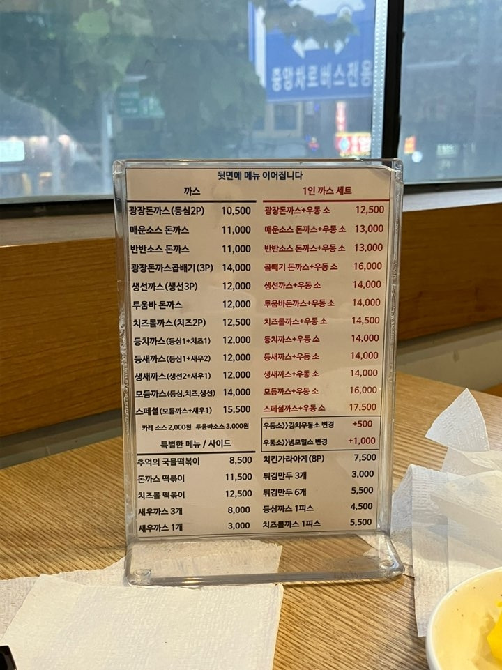돈까스는 어릴 적 우리 집 외식 메뉴였던 탓에 가끔 먹고 싶어지는 때가 있다. 이 날도 마찬가지였고, 일본식 돈까스 말고 경양식 옛날 돈까스가 먹고 싶었다. 친구랑 돈까스 집을 이리저리 찾다가 종로5가에 있는 <돈까스광장>이라는 가게를 찾아갔다. 약국과 상점들이 잔뜩 있는 거리에서 돈까스집을 찾는 것이 쉽지 않았는데, 1층이 아닌 2층에 있었기 때문이었다.