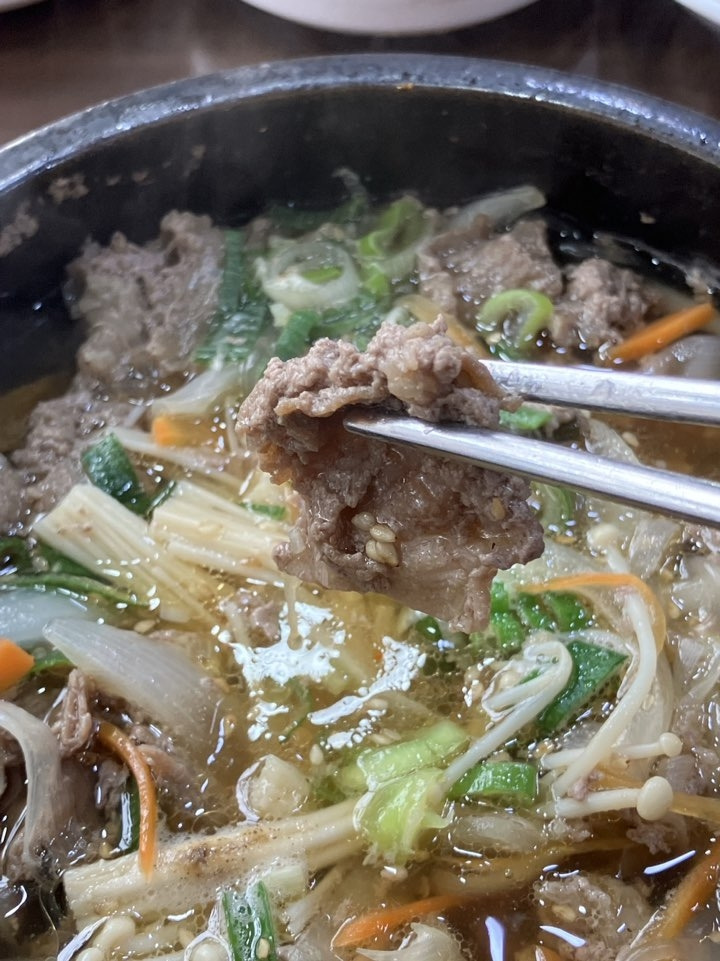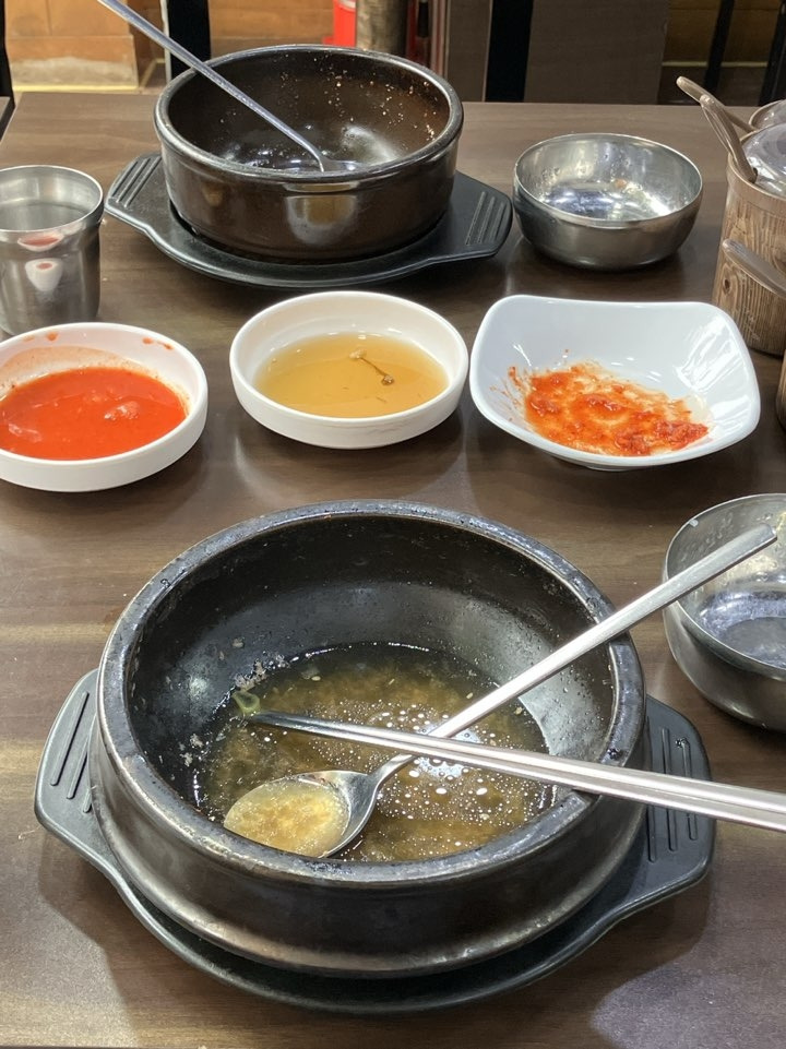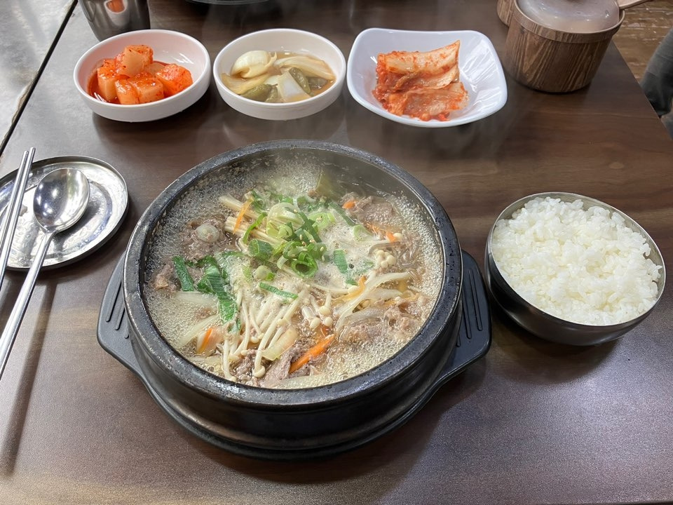 주문 후 잠시 기다리니 순대국밥과 뚝배기불고기가 나왔다. 순대국밥은 건더기가 꽤 많이 들어있었고, 유난히 뽀얀 국물이었는데, 식당 직원분이 설렁탕 국물을 육수로 쓴다고 했다. 그래서 그런지 다른 순댓국과는 다른 육수 맛이 인상적이었다. 그리고 뚝배기불고기는 우리가 생각하는 딱 그 맛 그대로였다. 넓고 얕은 뚝배기에 소고기, 당면 그리고 자작한 국물까지. 나에게는 추억의 맛이라고나 할까? 쌀쌀해진 날씨에 딱 맞는 메뉴들이었다. 배가 고팠던 이유도 있었겠지만 순댓국도, 뚝배기불고기도, 그리고 같이 나온 반찬들도 우리들의 입맛에 잘 맞아서 둘다 맛있게 한 그릇을 하고 나왔다.