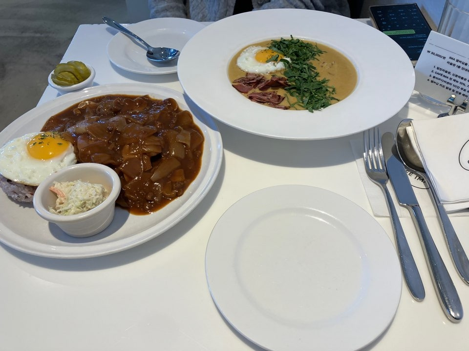 메뉴를 고르고 직접 주문을 하러 가서 주문을 하면 자리로 음식을 가져다 주는 방식이었다. 점심때에는 식사로 먹기에 좋은 <카페 이마>를 유명하게 만든 함박스테이크와 카레가 있었다. 메뉴 각각 하나씩을 주문하고 음료까지 2천원 할인을 받아 야무지게 주문을 했다. 메뉴가 많지 않아서인지 주문하고 얼마지나지 않아 나왔는데 커다란 접시에 먹음직스럽게 담겨 나왔다. 함박스테이크는 어릴 적 경양식 레스토랑에서 먹었던 그런 느낌이어서 괜시리 반가운 기분이 들었다. 그리고 상대적으로 덜 유명한 카레는 예상했던 것보다 부드럽고 맛있었다.