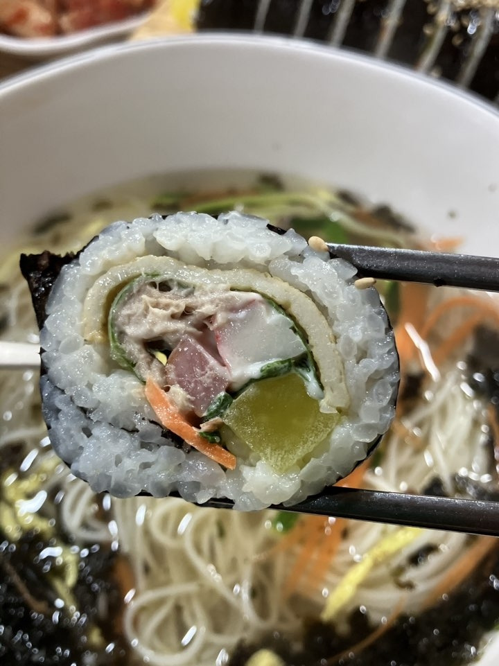 잔치국수 두 그릇과 참치김밥 한 줄. 이렇게 주문을 하면 8,000원! 이 날 점심에 먹은 쌀국수 한 그릇이 10,500원이었는데... 순간 현타가 왔다. 하지만 광화문 한복판의 임대료와 소고기 고명의 유무가 다르니 어쩔 수 없는 일이긴 할 것이다. 금방 잔치국수와 참치김밥이 준비되었고 추운 날씨에 따뜻한 국물을 쭉 들이키기 시작했다. 시장이 반찬이었는지 날씨가 추워서 그랬던건지 잘 시켰다는 생각이 들었다.