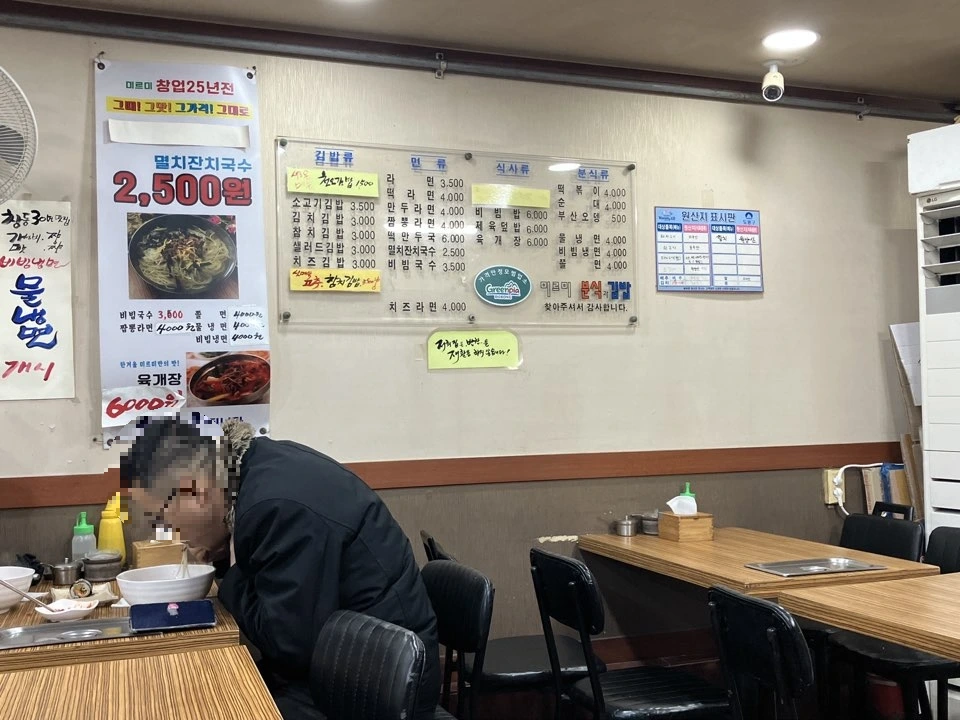 가게에 들어서자 갑자기 타임머신을 타고 과거로 돌아간 느낌이었다. 딱 어릴적 갔던 동네 분식점 분위기였는데 사실 그닥 깨끗하지도 않고 낡은 분위기라고 할 수 있지만 크게 신경쓰는 타입이 아니라서 난 별 생각이 안들었다. 자리를 잡고 앉자마자 눈에 들어 온 잔치국수 2,500원! 10,000원짜리 한 장으로 한 끼 밥 사먹는 것조차 쉽지 않은 요즘에 2,500원이라니! 놀라운 가격에 주문을 하지 않을 수 없었다.