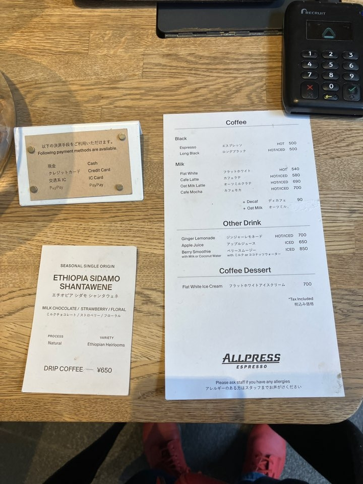 카페라고는 하지만 막상 내부에 좌석 공간은 별로 없다. 그 대신 로스팅하는 공간이 거의 대부분을 차지하고 있었다. 단독으로 사용하는 건물은 꽤 큰데, 정작 대략 5-6개쯤 되는 테이블, 여기에 가게 앞 벤치가 전부이다. 나는 어쨌든 미술관에 가는 길이었으므로 테이크아웃 해서 공원을 걸으며 마시기로 했다. 메뉴 종류는 적은 편이었다. 본격적인 로스터리 카페들은 원두에 자신이 있어서 그런지 이런저런 메뉴들이 많지 않고 대부분 메뉴가 단촐한 편이기는 하다. 기본 에스프레소나 롱블랙(500엔) 이외에 원두를 정해서 핸드드립(650엔)으로 내려주는 커피가 있었는데, 내가 갔던 날은 에티오피아 시다모를 로스팅하는 날이었던 모양이다. 시다모는 평소에 자주 마시는 원두이기도 하니, 나의 오늘의 커피는 롱블랙으로 선택!