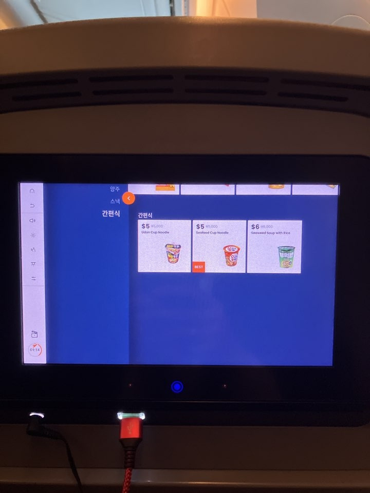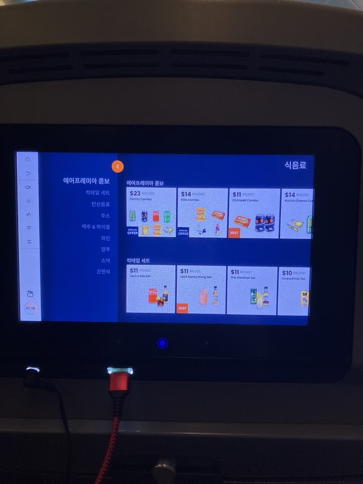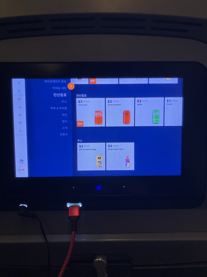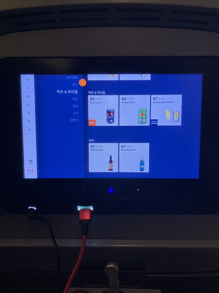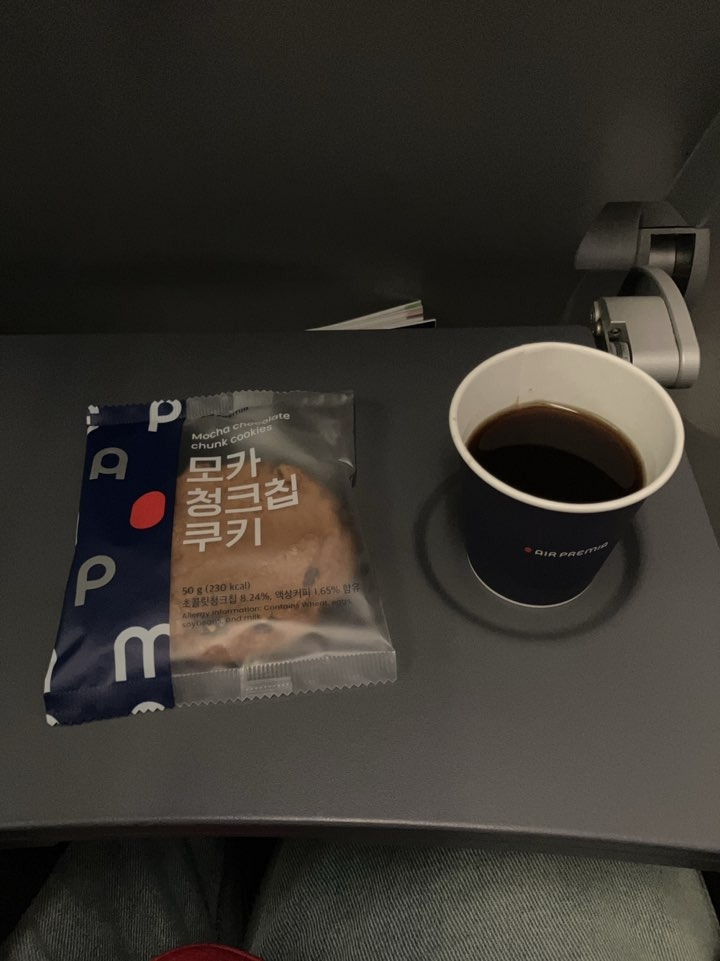 짧은 연휴가 끼어 있어서 그랬는지 공항에도 비행기에도 사람들이 제법 많았다. 덕분에 이래저래 기다리는 시간도 길었지만 일단 비행기에 올라타고 보니 그런 기다림은 다 잊혀진다. 기내 좌석은 3-3-3 배열이었고, 좌석 앞에는 개인 모니터가 설치되어 있었다. 창문은 덮개가 있는 게 아니라 버튼으로 밝기 조절이 가능한 최신형(?)이었다. 에어 프레미아가 자랑하는 좌석 간격도 확실히 LCC 비행기들보다는 더 넓어서 쾌적하고 좋았다. 이륙 전에 승무원들이 개인 이어폰을 나눠주었고, 이륙 후에는 커피(혹은 물)와 쿠키를 나눠주었다. 갈 때에는 모카 청크칩 쿠키, 돌아올 때에는 크랜베리 치아시드 쿠키였다. 쿠키의 크기가 꽤 커서 간단한 요기는 될 정도였다. 커피와 쿠키 등 제공되는 먹거리 외에 추가 주문을 해서 먹을 수도 있었는데, 개인 모니터에서 메뉴를 확인하고 주문을 할 수 있었다. 먹거리의 종류는 간단한 것들로 다양한 편이었고, 가격은 다른 저가 항공사들과 비슷한 가격대였다.
