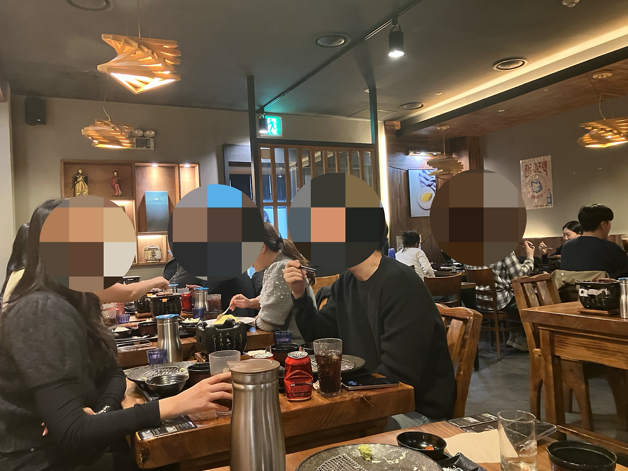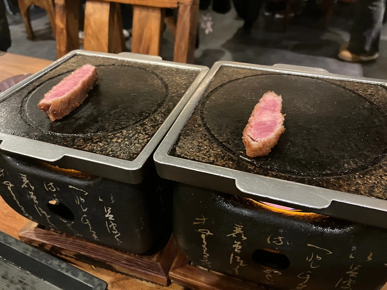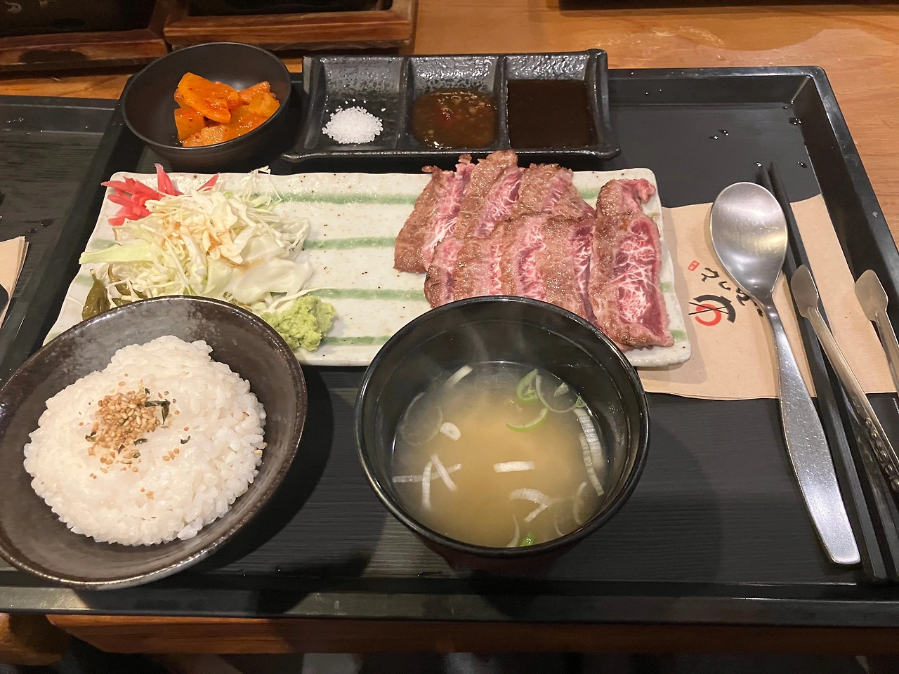 미리 예약을 한 덕분에 웨이팅 없이 좌석에 앉을 수 있었다. 퇴근 시간을 지나쳐 가면서 점점 식당 앞에 줄을 서서 기다리는 사람들이 많아지는 모습을 볼 수 있었다. 메뉴는 테이블에 부착된 QR코드에 접속해서 볼 수 있고 그걸로 주문까지 할 수 있는 방식이었다. 우리는 식당의 대표 메뉴인 규카츠(180g, 19,000원)와 오므라이스(14,000원), 그리고 스테키 정식(180g, 19,000원)을 주문하고, 음료로 맥주도 한 잔씩 주문했다. 중앙에 작은 화로 두 개가 세팅되고 주문한 메뉴들이 나오기 시작했다. 규카츠와 스테키 정식은 준비된 화로에 취향대로 구워 먹는 방식이었는데, 식감이 꽤 부드러워서 질리지 않고 계속 먹을 수 있을 것 같다는 생각이 들었다. 그리고 오므라이스는 잘 볶아낸 밥 위에 노오란 달걀이 타원형으로 올라가 있는 상태로 나왔다. 칼로 달걀을 반으로 가르면 촉촉한 달걀이 밥 위로 덮는 형태. 특히 보들보들한 달걀이 인상적이었는데, 하지만 그와는 반대로 아래쪽에 깔린 볶음밥은 별다른 인상을 남기지는 못했다.