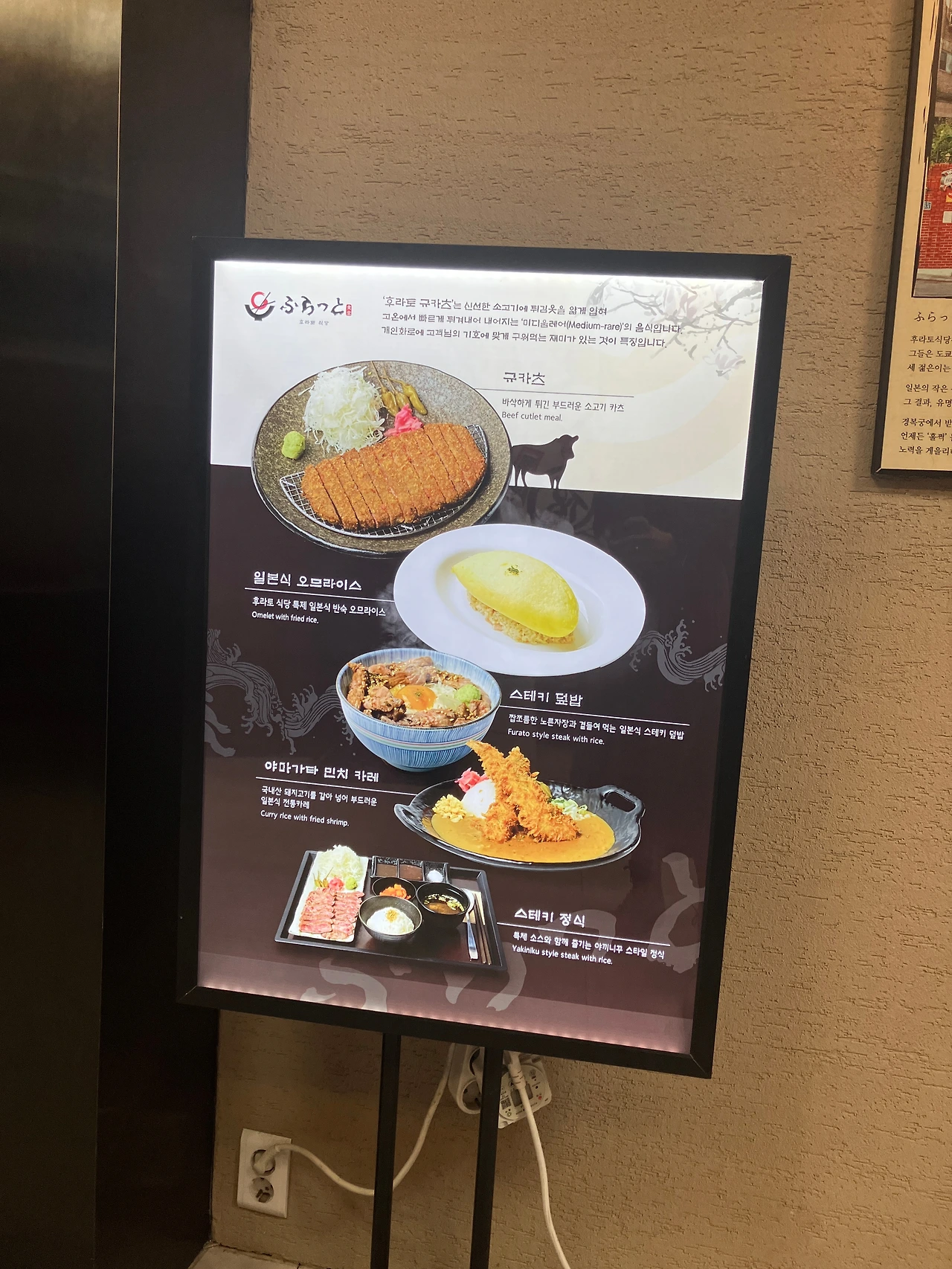 모처럼 친구들과 불금을 보내기로 했다. 맛있는 저녁을 먹고 수다를 충전하기 위해 광화문에서 만났다. 뭘 먹을까 고민 끝에 결정한 장소는 평소에 가보고 싶었던 <후라토식당>. 이 식당은 규카츠와 오므라이스로 유명하다고 한다. 평일 점심에는 예약이 되지 않기 때문에 줄을 서야 하는 곳이라 좀처럼 가 볼 일이 없었는데, 저녁에는 예약이 가능해서 친구들과 가보기로 했던 것이다. 사실 회사 근처에서 저녁 시간을 보내고 싶지 않다는 생각이 들었지만, 이번에는 웨이팅이 걸리는 게 더 싫다는 마음 덕분에 그래 가보자! 하게 된 것이다. 후라토식당은 광화문에 있는 이 가게가 본점이라고 하며, 위치는 세종문화회관 뒷쪽 로얄빌딩 지하에 있다. 빌딩 지하를 한 바퀴 돈 후에야 겨우 식당을 찾아 들어갈 수 있었다.