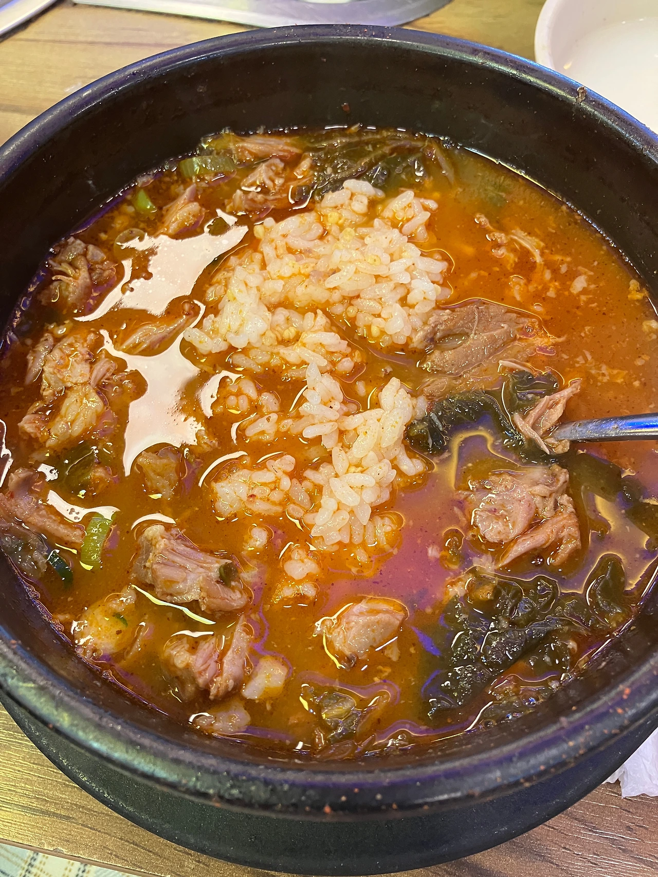이곳은 아마도 녹양역 인근에서는 이미 꽤 유명한 식당인 것 같았다. 가게에 들어서니 식사시간이 아닌데도 꽤 많은 사람들이 식사 중이었다. 가게 내부는 꽤 넓은 편이라 별다른 웨이팅은 하지 않아도 되었지만, 행여 사람이 몰리는 경우에는 짧게나마 웨이팅이 있을 수도 있을 것 같다는 생각이 들었다. 자리를 잡고 뼈다귀해장국(10,000원)과 막걸리(4,000원) 한 병을 주문했다. 소주 한 잔을 할까 하다가 피곤해진 몸에 소주가 더해지면 집에 돌아가는 길이 힘들어질 것 같았기 때문에 막걸리로 타협을 한 것이다. 오래 기다리지 않아 바글바글 끓는 뚝배기에 뼈다귀가 가득 담긴 뼈다귀해장국을 받아들 수 있었다. 뚝배기에 우거지와 커다란 뼈다귀 두 개가 들어있었는데, 살코기가 꽤 많아서 한참을 발라 먹어야 했다. 국물은 느끼하지 않고 아주 약간 걸쭉한 느낌이었다. 따뜻한 국물과 함께 고기를 먹으니 피곤했던 몸에 힘이 들어갔다. 밥도 윤기나고 찰진 스타일이어서 개인적으로 꽤 만족스러웠다. 정신없이 먹다보니 어느새 한 그릇 뚝딱 해버렸다.