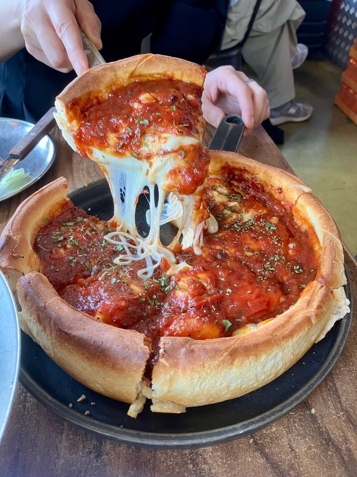 먼저 나온 샐러드는 달콤한 소스가 올라간 치킨 샐러드였는데 무난하게 먹을 수 있는 맛이었다. 곧이어 8인치 클래식 피자가 나왔는데, 한조각 들어올리니 치즈가 쭉 늘어나서 치즈를 좋아하는 나에게는 아주 만족스러운 비주얼이었다. 시카고 피자는 본고장인 시카고에서 먹고 한국에서는 먹을 기회가 많지 않았는데, 오랜만에 먹을 수 있어서 좋았다. 우리가 주문한 8인치 피자는 처음 봤을때에는 크지 않아 금방 먹을 수 있겠다는 생각이 들었다. 하지만 먹다보니 금새 배가 불러왔다. 둘다 많이 먹는 타입들은 아니라서 6인치를 주문했어도 좋았겠다 싶었지만 후회해봤다 이미 늦었다. 다 먹는 수 밖에. 배가 엄청 불렀지만 꾸역꾸역 다 먹고 부른 배를 두드리며 가게를 나왔다.