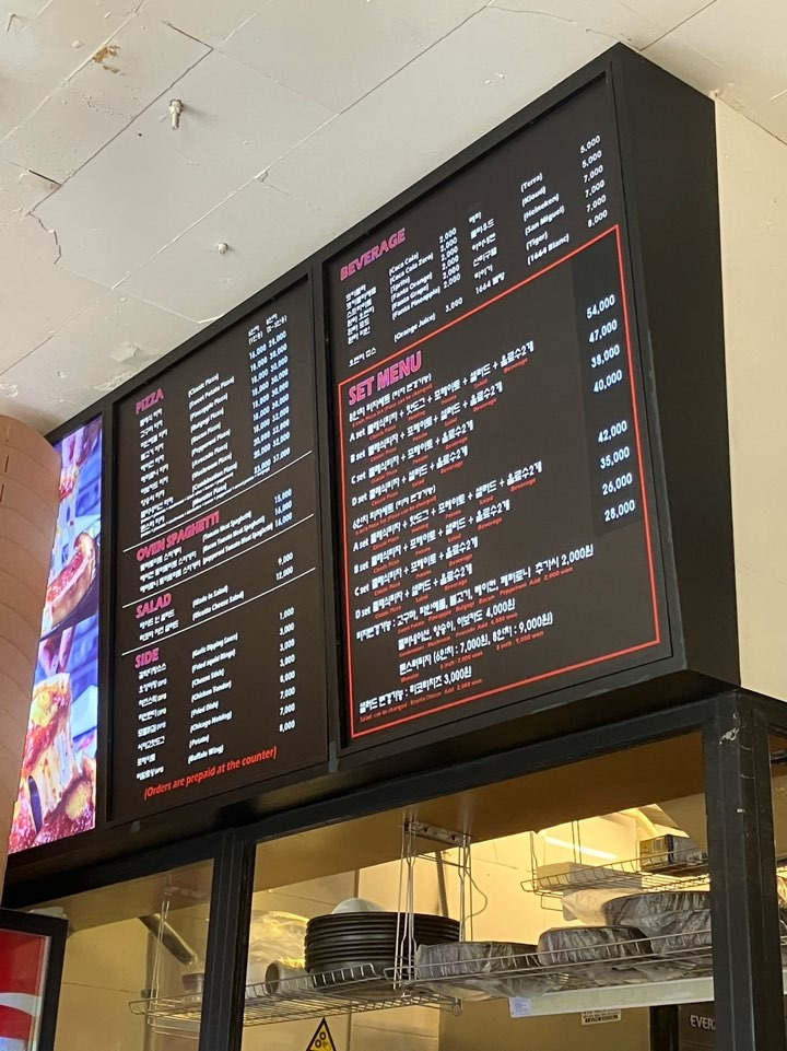 건물 옆 좁은 계단을 올라가면 가게 입구로 들어갈 수 있는데, 점심시간에 방문한 탓에 웨이팅이 있었다. 대기명단에 이름을 올리고 미리 메뉴를 고르고 주문을 먼저 했다. 우리가 고른 메뉴는 8인치 클래식 피자와 샐러드, 음료 두 잔이 포함된 세트D(40,000원). 피자는 6인치와 8인치 중에 고를 수 있었는데 많이 먹고 싶었던 날이었기 때문에 8인치로 결정! 주문을 하고 얼마 되지 않아 자리를 안내받을 수 있었다.(대략 15분쯤 기다렸을까?) 개방감 있는 창가에 앉고 싶었지만 사람이 많은 시간에 맘에 드는 자리에 앉는 것은 사치처럼 느껴졌다. 자리를 안내받고 직접 냉장고에서 음료수를 꺼내고 피클, 핫소스, 파마산, 냅킨 등을 챙기고나니, 바로 샐러드가 나왔다. 미리 주문을 한 덕분에 앉자마자 식사가 시작될 수 있었던 것이다.