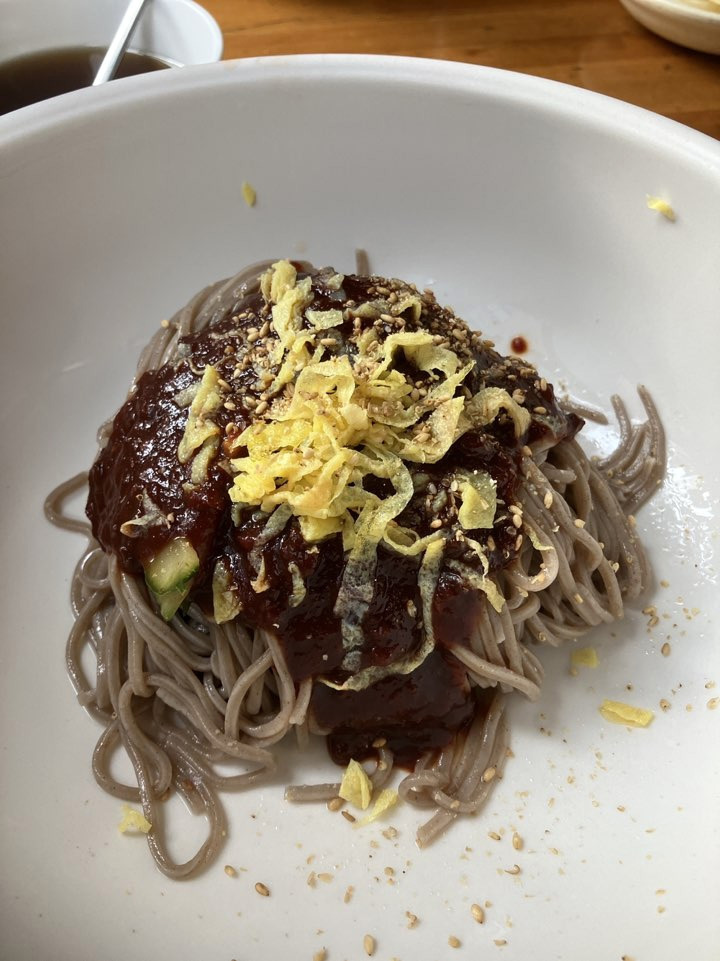 전체적으로 심플하고 소박한 밥상이라는 생각과 사람에 따라 맛이 있다고 느끼기 힘들겠다는 생각이 들었다. 난 시중에서 파는 비빔면의 인공조미료 맛이나 자극적인 맛을 그닥 좋아하지 않는 편이라 <유림면>의 비빔메밀은 맛있다고 느꼈다. 담백하고 자극적이지 않은 음식을 좋아하시는 엄마랑 오고 싶다는 생각도 들고. 줄이 길지 않은 시간에 엄마를 모시고 다시 한 번 가봐야겠다.
