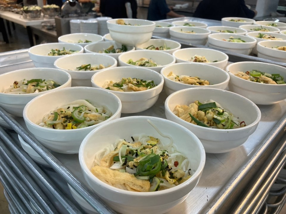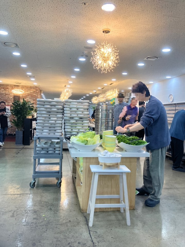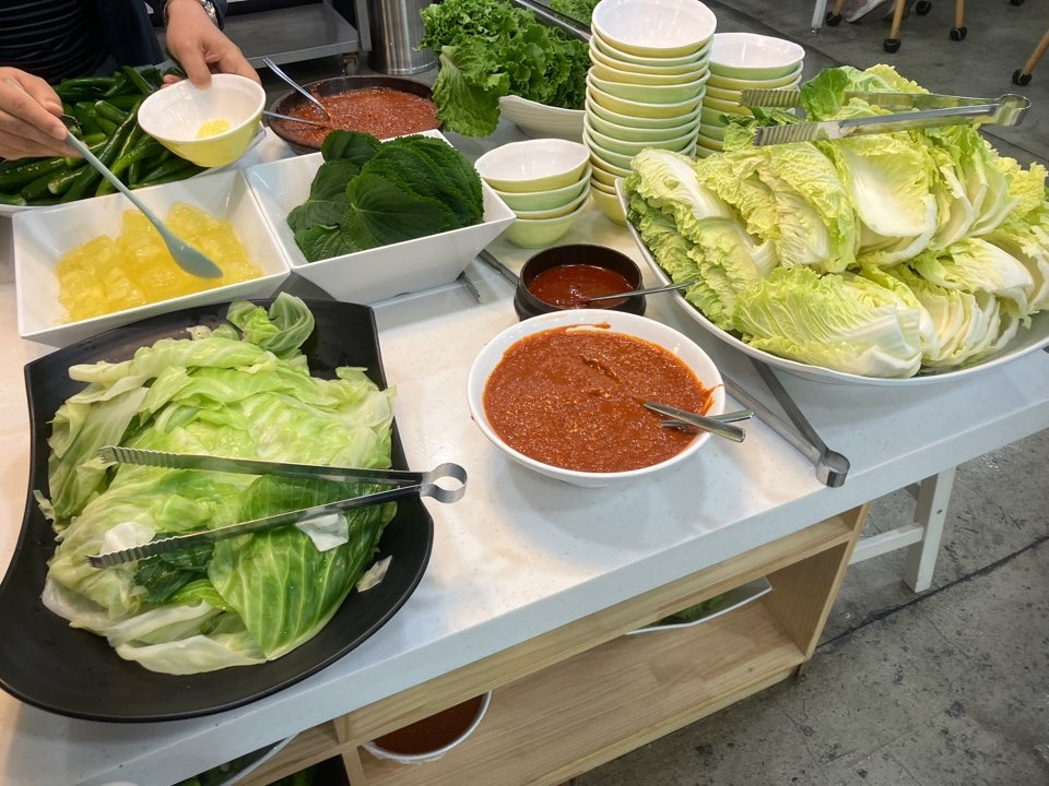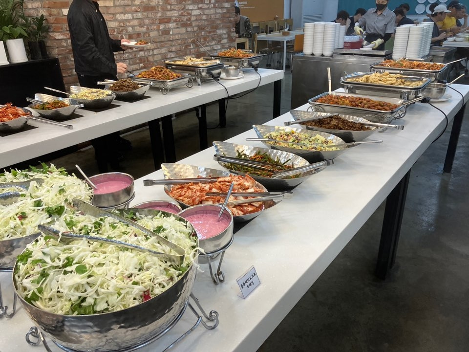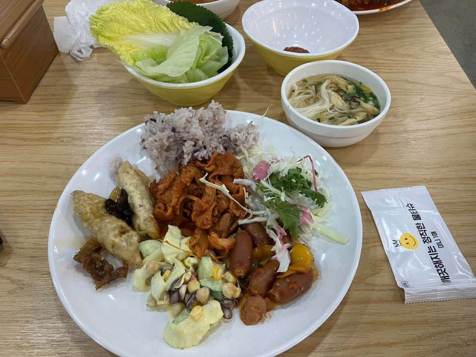 식당입구에서 결제를 하고 본격적인 식사를 하는데, 역시 한식뷔페의 꽃은 제육볶음인건지 다양한 반찬들 사이에서도 잔뜩 쌓여있는 제육볶음을 만날 수 있었다. 기본 반찬은 매일 바뀌겠지만 내가 갔던 날은 샐러드, 쥐포볶음, 비엔나 소시지 볶음, 만두 튀김 등이 있었고 한 쪽에 따로 마련된 테이블에는 잔치국수와 다양한 쌈 종류들이 준비되어 있었다. 쌈 종류가 생각했던 것보다 많아서 평소에 잘 먹지 못하는 쌈들을 잔뜩 먹을 수 있어서 좋았다. 하지만 한 접시를 비우고나니 더이상 먹기가 힘들었다. 무제한으로 먹을 수 있고 음식이 앞에 잔뜩 쌓여있으니 오히려 더 많이 먹히지가 않았다. 적게 담은 두 번째 접시를 끝으로 식사를 마무리하게 되었다.