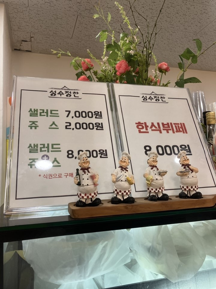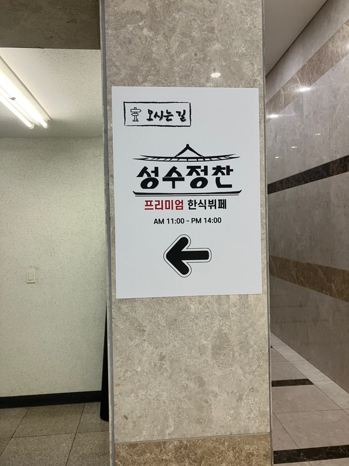 성수동에 갔지만 시간이 별로 없었던 어느 날, 점심은 먹어야겠고 뭘 먹을지 고민하고 싶지도 않았다. 그래서 찾아간 한식뷔페 <성수정찬>, 예전에 우연찮게 알게 되었는데 이번에 처음 가보게 되었다. 성수역에서 조금은 떨어진 예림당 출판사 지하에 위치한 이 식당은 성수에서 일하는 직장인들이 많이 찾는 식당이라고 한다. 표지판을 따라 건물 지하로 내려가자 넓은 공간에 식당이 있었다. 지하에 위치한 식당은 입구와 출구가 나누어져있어 입구로 들어가 계산을 먼저 하고 자리를 잡고 식사를 한 후 출구로 나가면 되는 구조. 깔끔하게 정돈된 내부에는 본격적인 점심시간이 되기 전인데도 불구하고 손님들이 점심식사를 하고 있었다. 물가 비싼 성수에서 8,000원에 양껏 먹을 수 있으니 인기가 있을 법 하다.