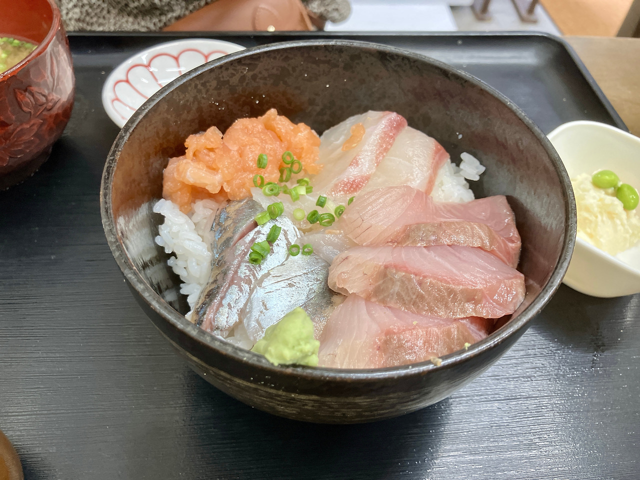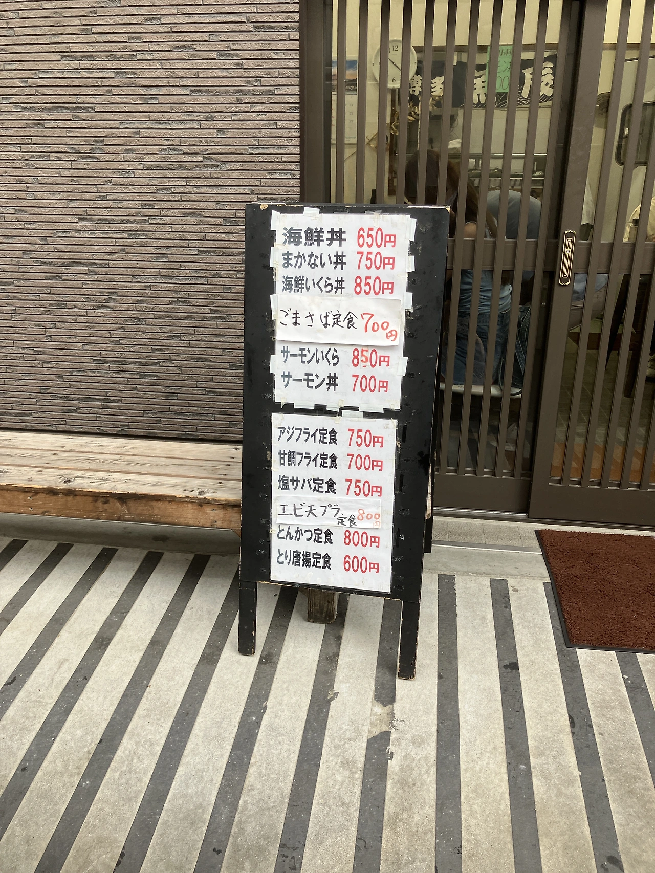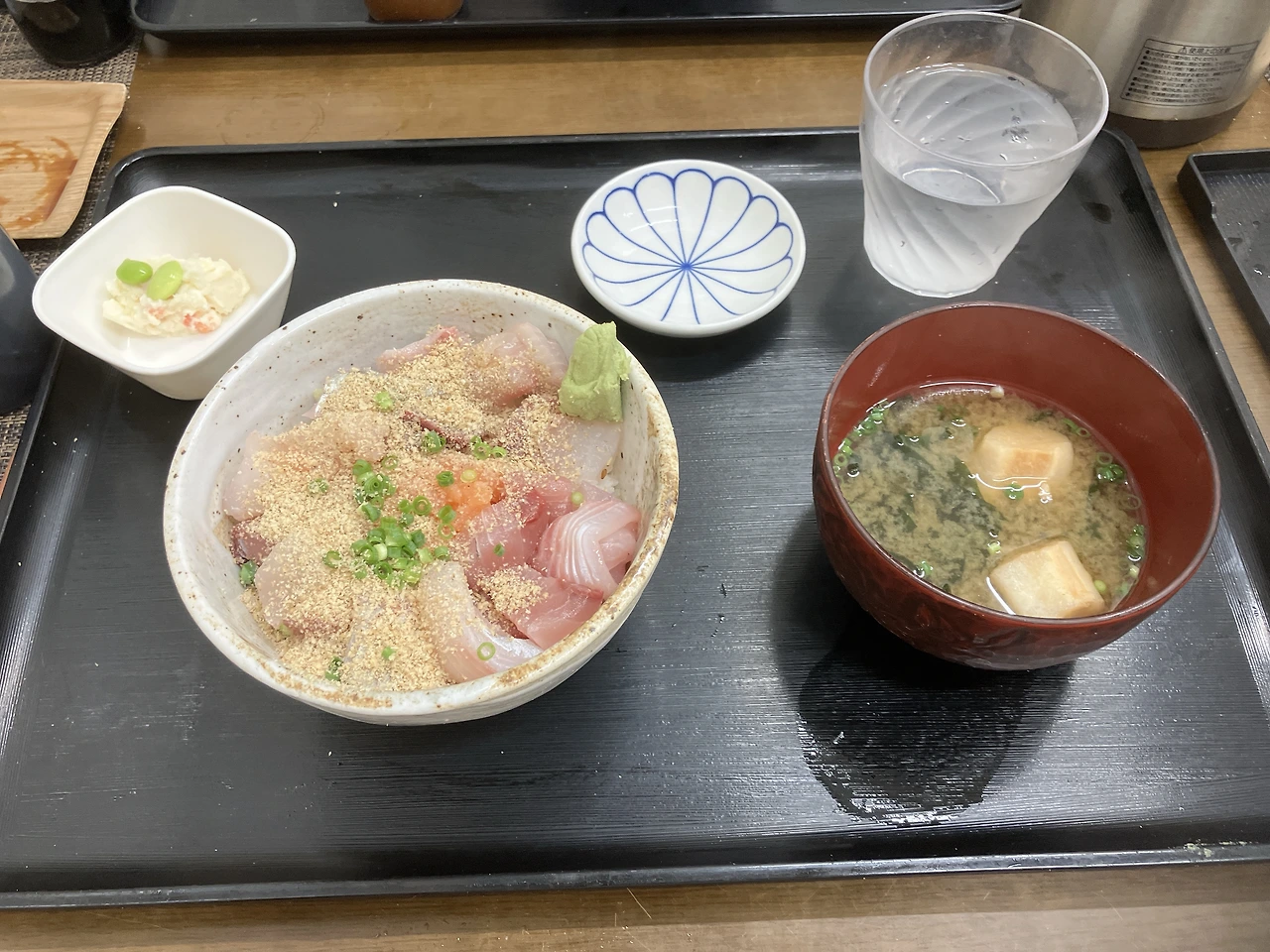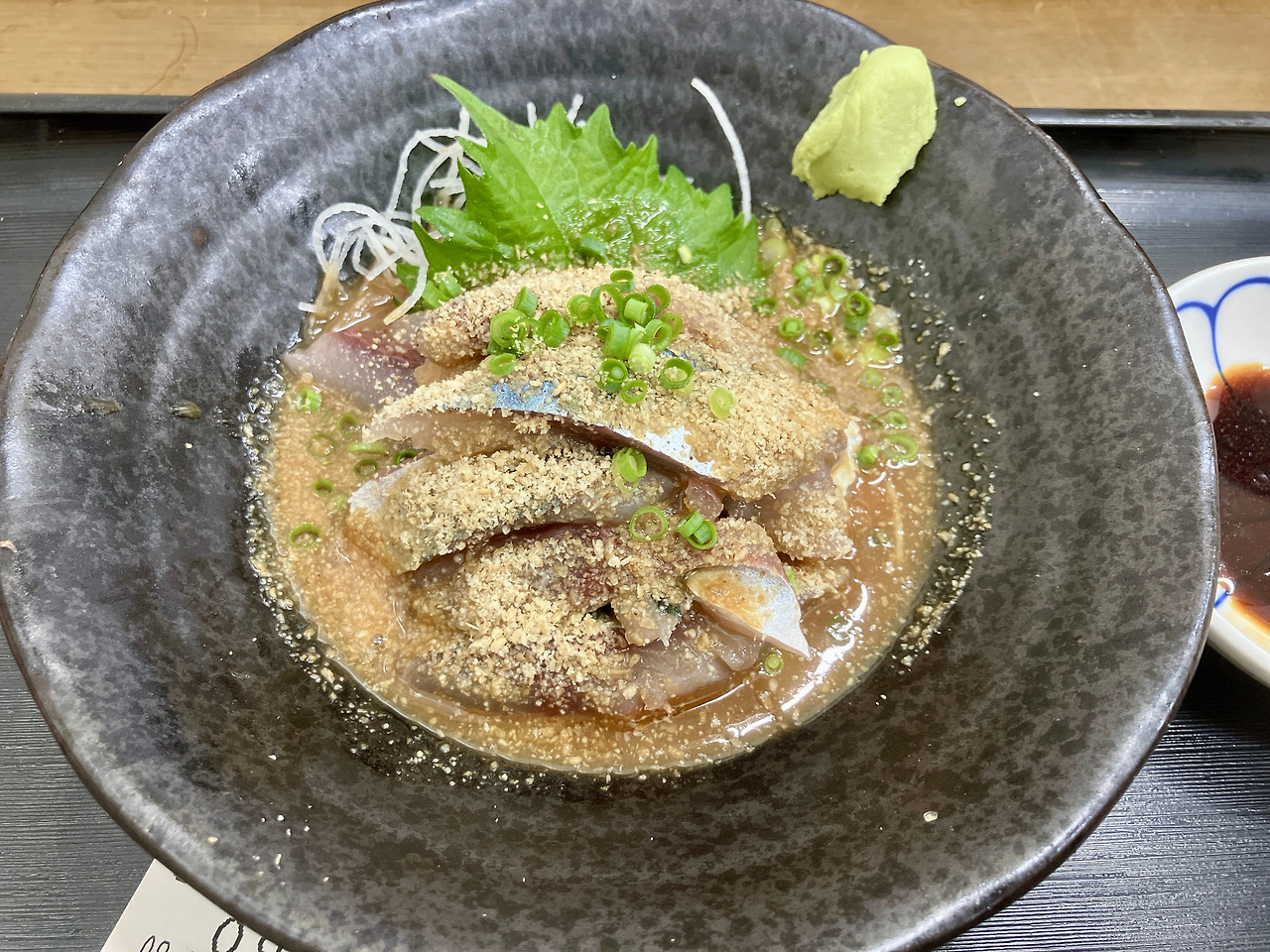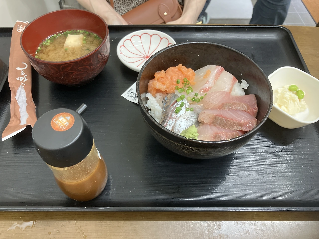 조금 기다려 주문을 넣고 조금 더 기다리자 우리가 주문했던 음식들이 제공되었다. 카이센동은 작은 밥 그릇에 4가지 정도회가 두툼하게 썰어 올라가 있었고, 마카나이동은 큐브모양으로 썰린 다양한 회가 밥 위에 그리고 참깨 가루가 뿌려져 있었다. 가격이 저렴한 만큼 양이 많진 않았지만 한 번에 많이 먹지 못하는 나에게는 적당한 양이었다. 신선한 회를 비롯해 귀엽고 앙증맞게 나온 감자샐러드와 따뜻한 미소까지 먹고 있자니 너무 행복했다. (물론 여행 자체가 행복했을 수 있다.) 밥을 먹다보니 다른 음식들도 궁금해져서 메뉴판을 둘러보다 발견한 메뉴! 후쿠오카 명물인 고마사바였다. 밥과 국이 포함된 정식도 있고, 단품으로 주문할 수도 있었는데, 우리는 600엔짜리 단품을 추가했다. 자판기에 메뉴 이름이 없어도 해당 금액만큼 티켓을 끊어서 가져다 드리면 된다. 넓적한 접시에 예쁘게 담겨 나온 고마사바는 눈이 즐거운 만큼 맛도 있었는데, 고등어 특유의 비린 맛도 없고 고소한 참깨와 간장소스까지 잘 어우러졌다. 나의 감과 선택은 틀리지 않았다며 뿌듯한 기분으로 즐거운 아침식사를 즐겼다. 다시 후쿠오카에 간다면 후쿠오카에서의 첫 식사는 이 곳으로 하러 갈거다.