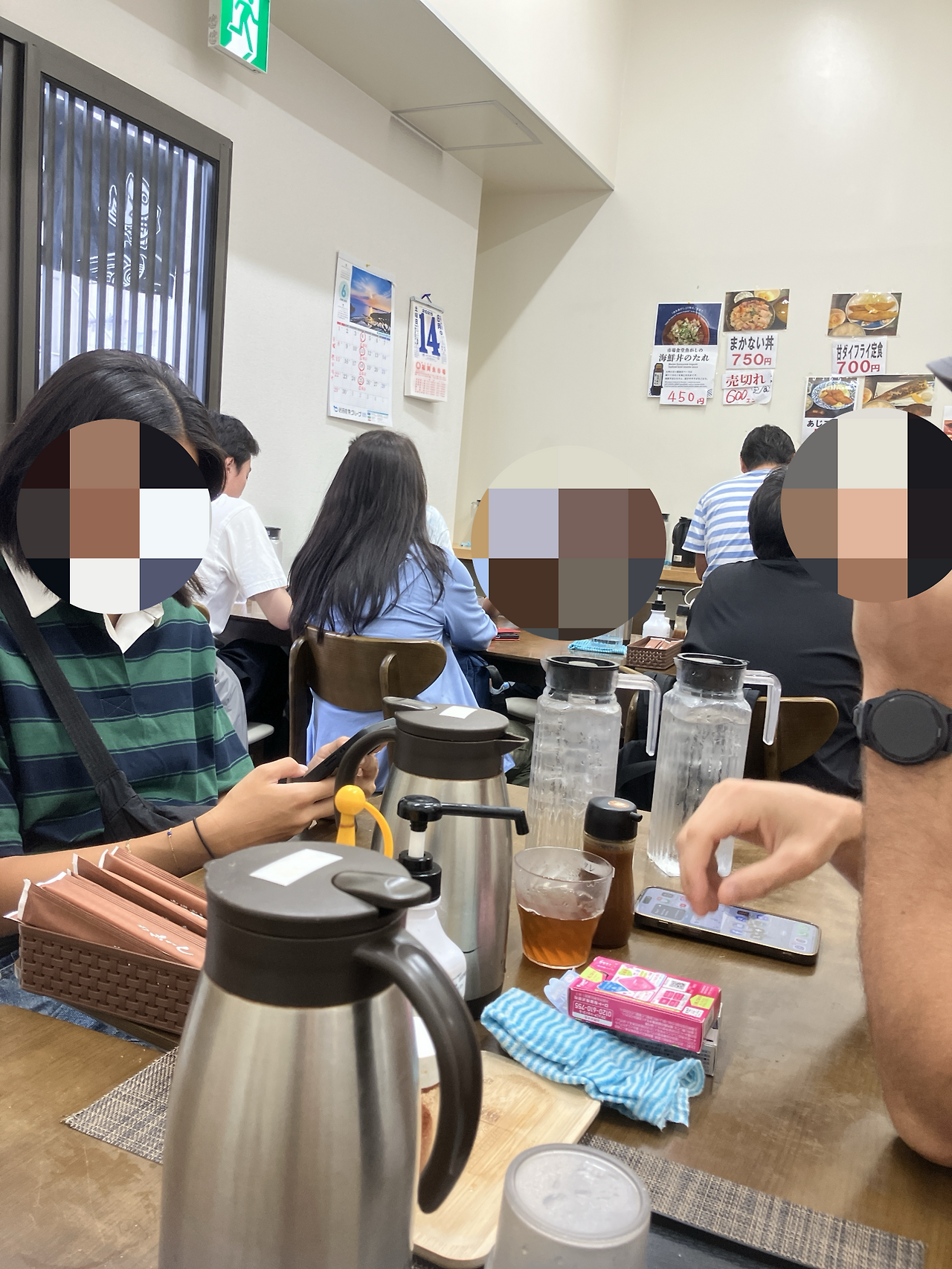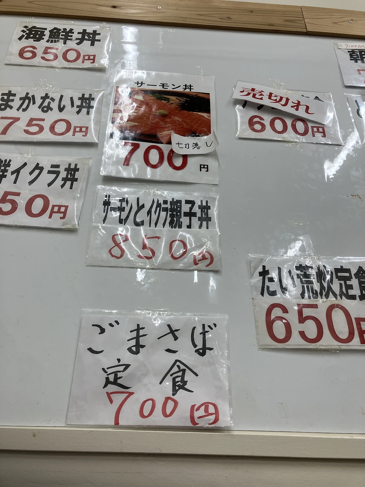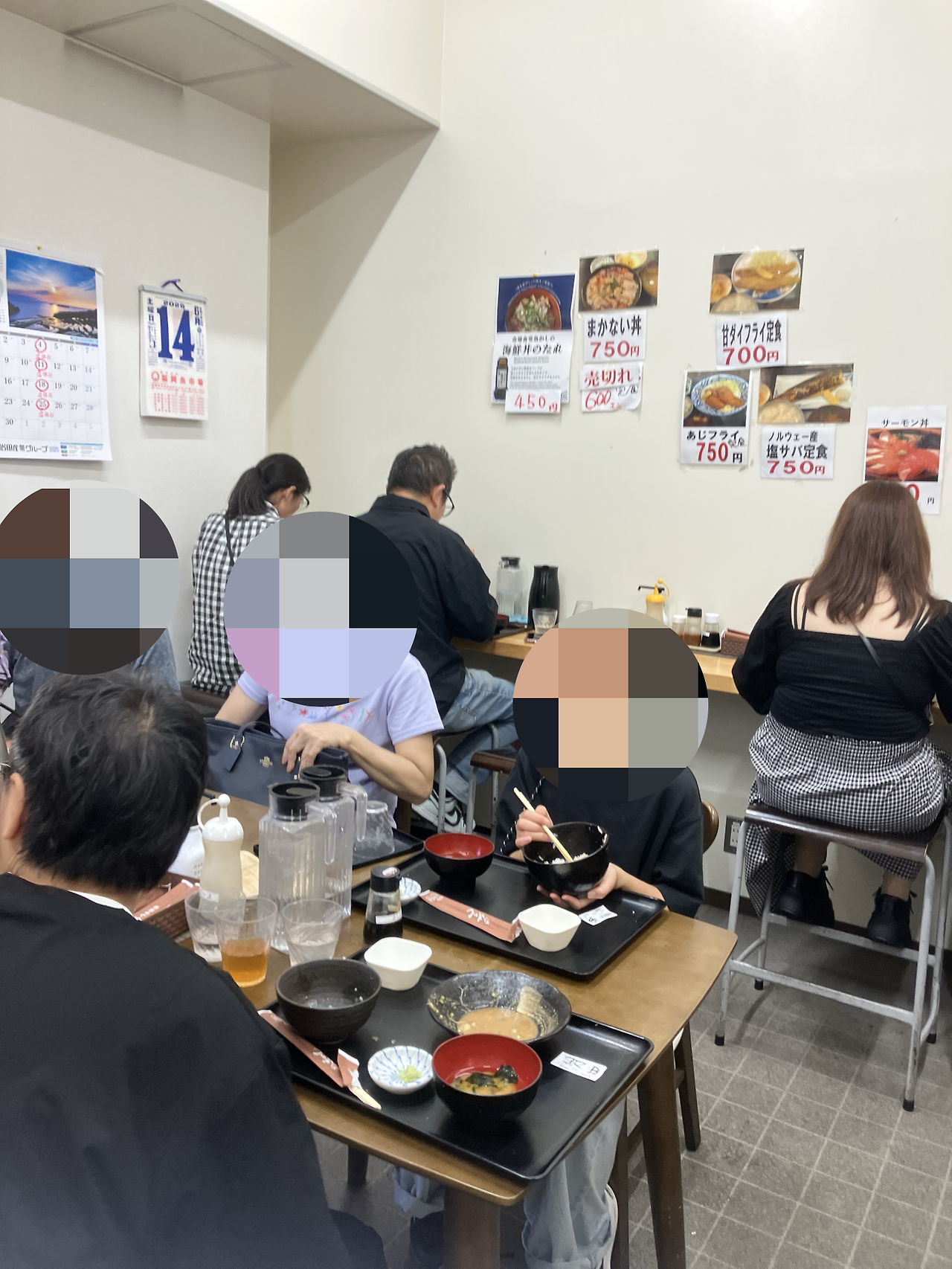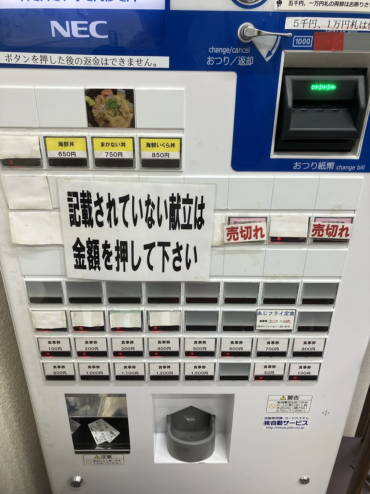 그 곳은 나가하마 선어시장 앞에 있는 <우오다쓰식당(魚辰食堂)>으로 시장 앞에 작게 위치한 식당이었다. 영업시간은 오전 6시부터 오후 2시까지. 새벽부터 점심까지만 장사를 하는 곳이라 일어나자마자 식당으로 향했다. 식당안으로 들어서자 작은 내부에 사람들이 거의 다 차 있었다. 가게에 들어서자마자 난 여러 번 놀랐는데 이른 아침부터 해산물 식사를 하는 사람들이 생각보다 많아서 놀랐고, 일하는 분들이 다 할아버지들이시고, 가격이 말도 안되게 저렴해서 놀랐다. 자리를 안내받아 앉은 후 가게 입구에 있는 자판기로 주문을 했다. 해산물 덮밥인 카이센동(580엔)과 직원들이 먹는 메뉴라는 뜻의 자투리 해산물덮밥 정도 되는 마카나이동(680엔)을 주문했다. 자판기에서 티켓을 받아서 서빙하시는 할아버지께 드리면 주방에 주문을 넣어주시는데, 손님들이 많아서 엄청 바쁘게 움직이고 계셨다.