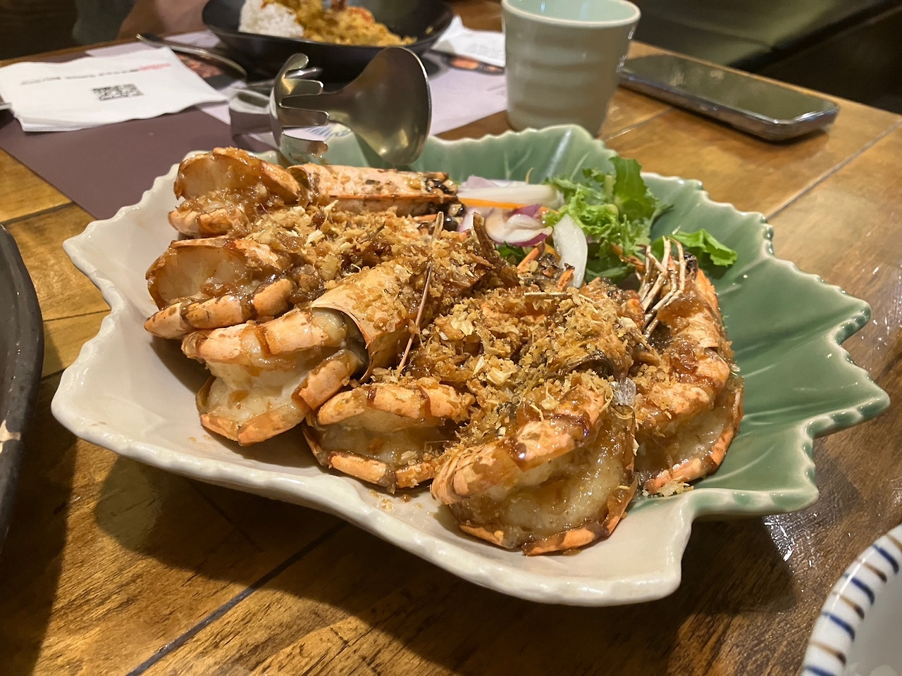 예약을 미리 하고 갔기 때문에 식당에 들어서자마자 자리를 안내받고 앉아 메뉴들을 정독하기 시작했다. 메뉴판은 테이블마다 있는 태블릿으로 보고 주문도 바로 할 수가 있었고, 종이 메뉴판도 있는 듯했다. 난 해산물 요리가 먹고 싶어서 간 것이기 때문에 해산물 요리 위주로 메뉴를 골랐다. 뿌팟퐁커리(36,000원)에 밥 추가(2,000원), 칠리농어(36,000원), 갈릭쉬림프(36,000원), 왕새우팟타이(19,000원)를 골랐다. 너무 해산물만 시켰나 싶어 예의상(?) 소고기덮밥(19,000원) 하나를 추가했다. 세트메뉴도 있었지만 먹고 싶은 메뉴 위주로 따로 주문을 했고, 나중에 계산할 때 세트에 들어갈 수 있는 메뉴는 묶어서 직원분이 할인을 해주셨다.